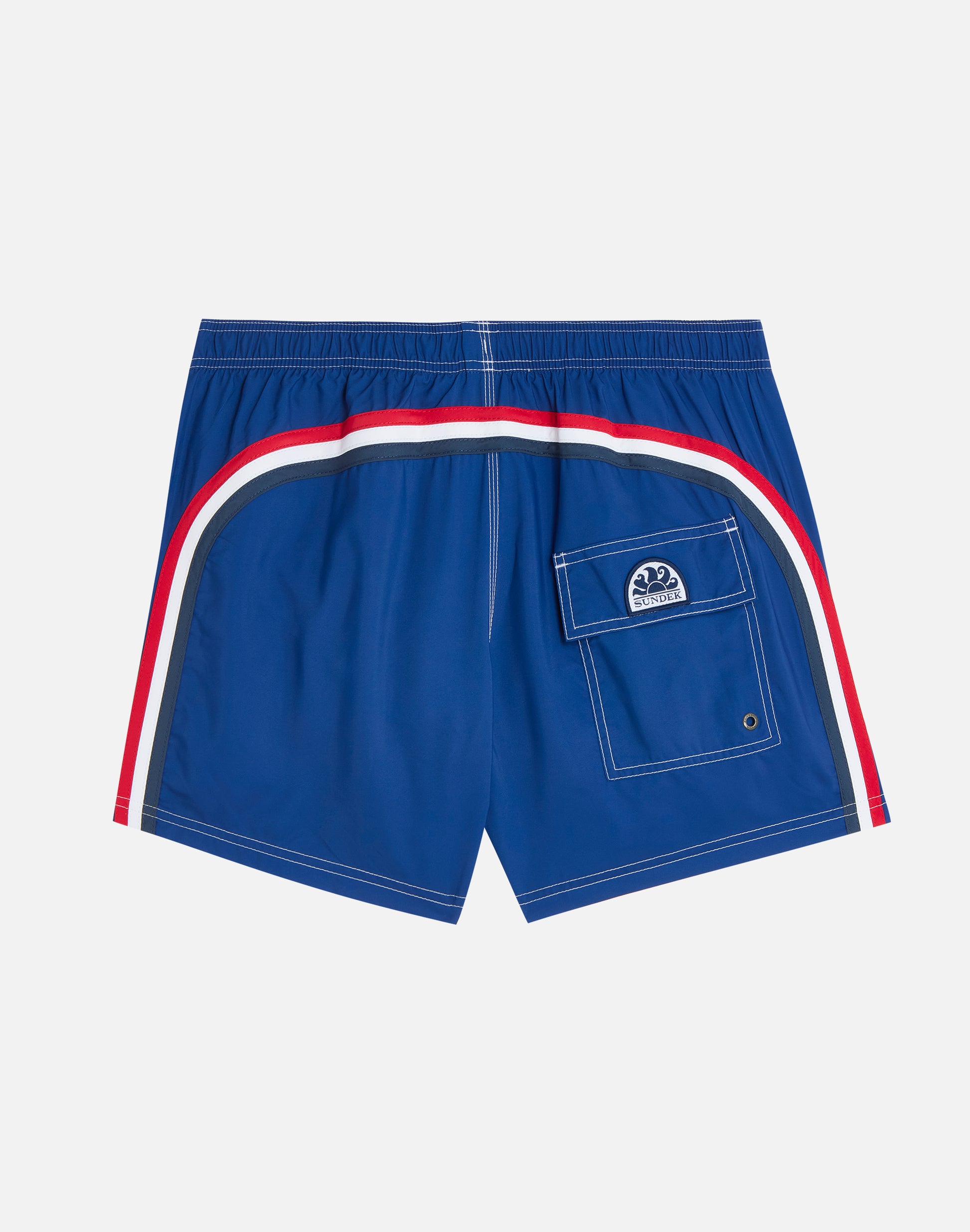 Men's shorts swimsuit made of Repreve® recycled fabric, super-lightweight quick-drying fabric. Sundek iconic rainbow detail on back and UK flag representation. Outer thigh length 14"/35 CM (in size M).