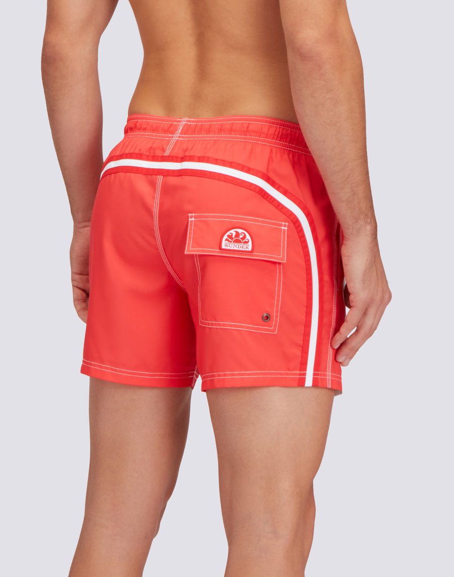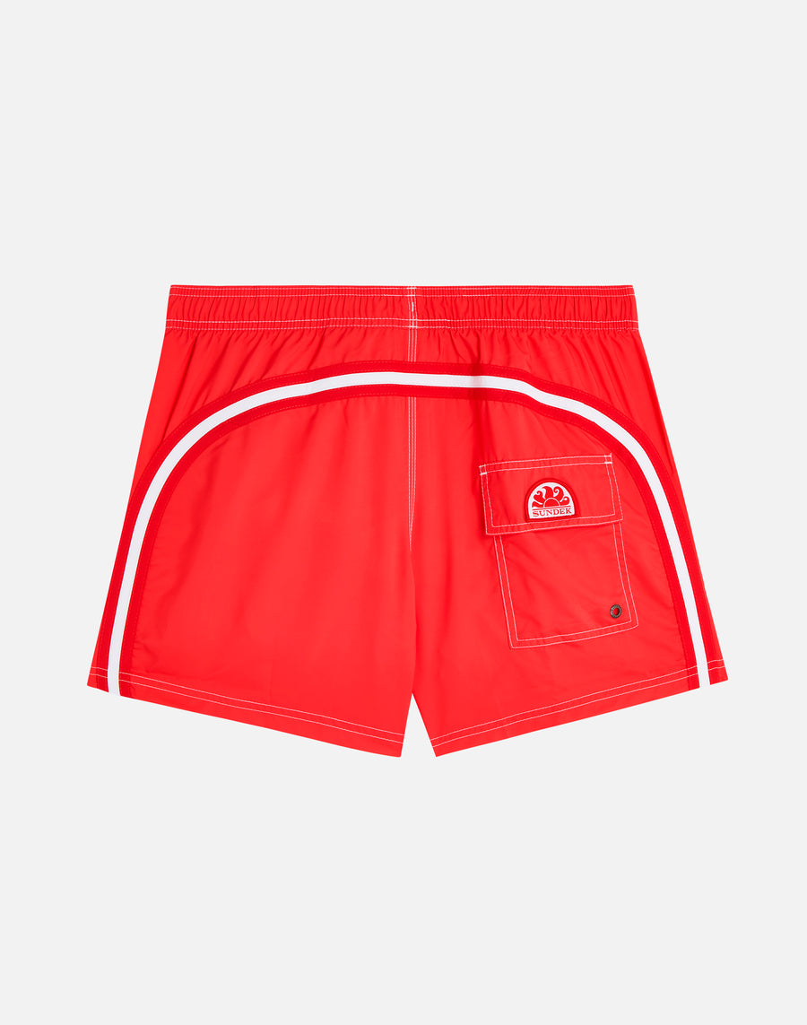 Men's shorts swimshorts made of Repreve® recycled fabric, super-lightweight quick-drying fabric. Sundek iconic rainbow detail on back and Canada flag representation. Outer thigh length 14"/35 CM (in size M).