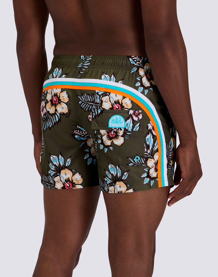 SHORT SWIM SHORTS WITH ELASTIC WAISTBAND IN REPREVE® RECYCLED POLYESTER WITH GRAPHIC FLOWER PRINT