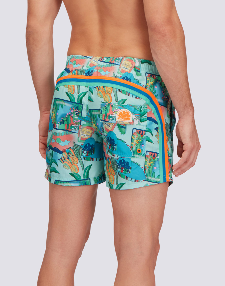 REPREVE® ELASTICATED WAIST SHORT SWIMSHORTS WITH GREETINGS FROM MEXICO PRINT