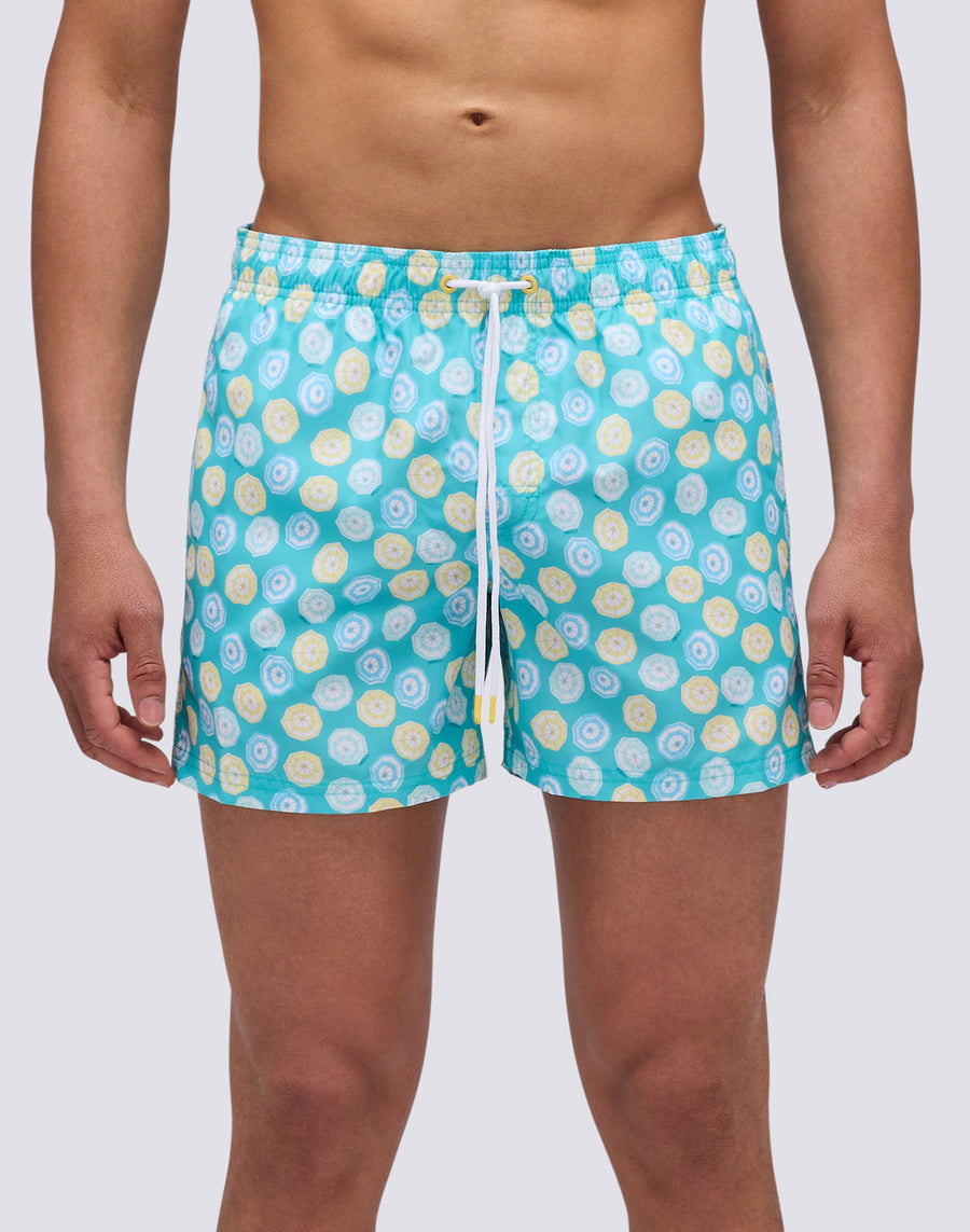 REPREVE® ELASTICATED WAIST SHORT SWIMSHORTS WITH MINI PARASOLS PRINT