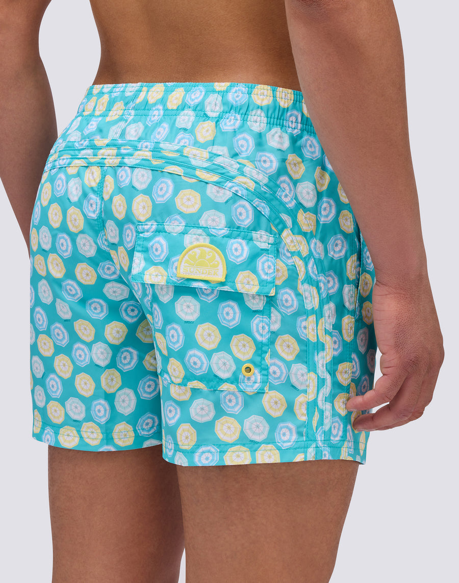 Swimsuit with elastic drawstring waistband, made from lightweight Repreve® fabric recycled from plastic bottles. Mini umbrella print and traditional Sundek rainbow on the back. Outer thigh width 14"/35 cm (size M).