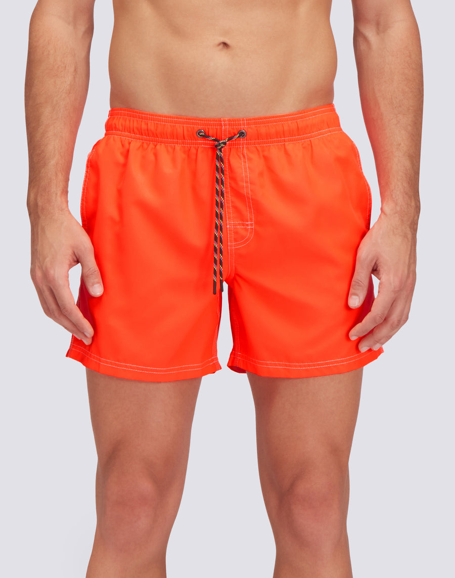 Lightweight, quick-drying, men's shorts swimshorts in recycled Repreve® fluo fabric. Sundek iconic rainbow detail on back and black drawstring strap. Outer thigh length 14"/35 CM (in size M).