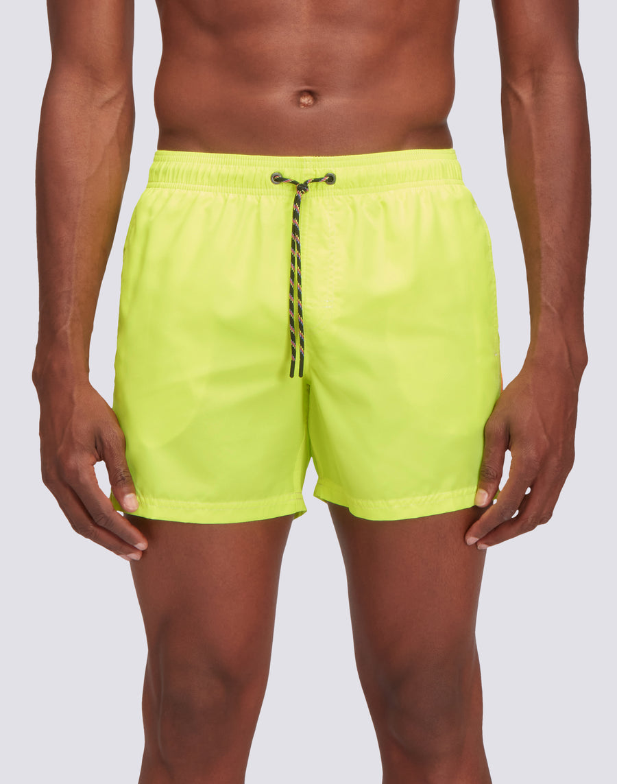 Lightweight, quick-drying, men's shorts swimshorts in recycled Repreve® fluo fabric. Sundek iconic rainbow detail on back and black drawstring strap. Outer thigh length 14"/35 CM (in size M).