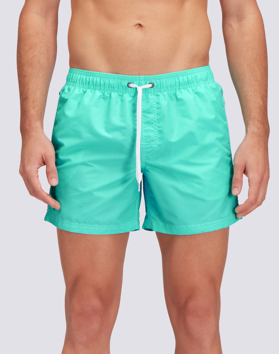 Short men's swim shorts with elasticated waist, drawstring and iconic Sundek rainbow on the back. This swimsuit is made with three-needle stitching and 100% of our historic fabric, nylon-taffeta: smooth as silk, light and resistant to everything, it dries very quickly to give you comfort everywhere, in the waves and outside waterfall. Length 35 cm (size M), measured on the outside of the leg.