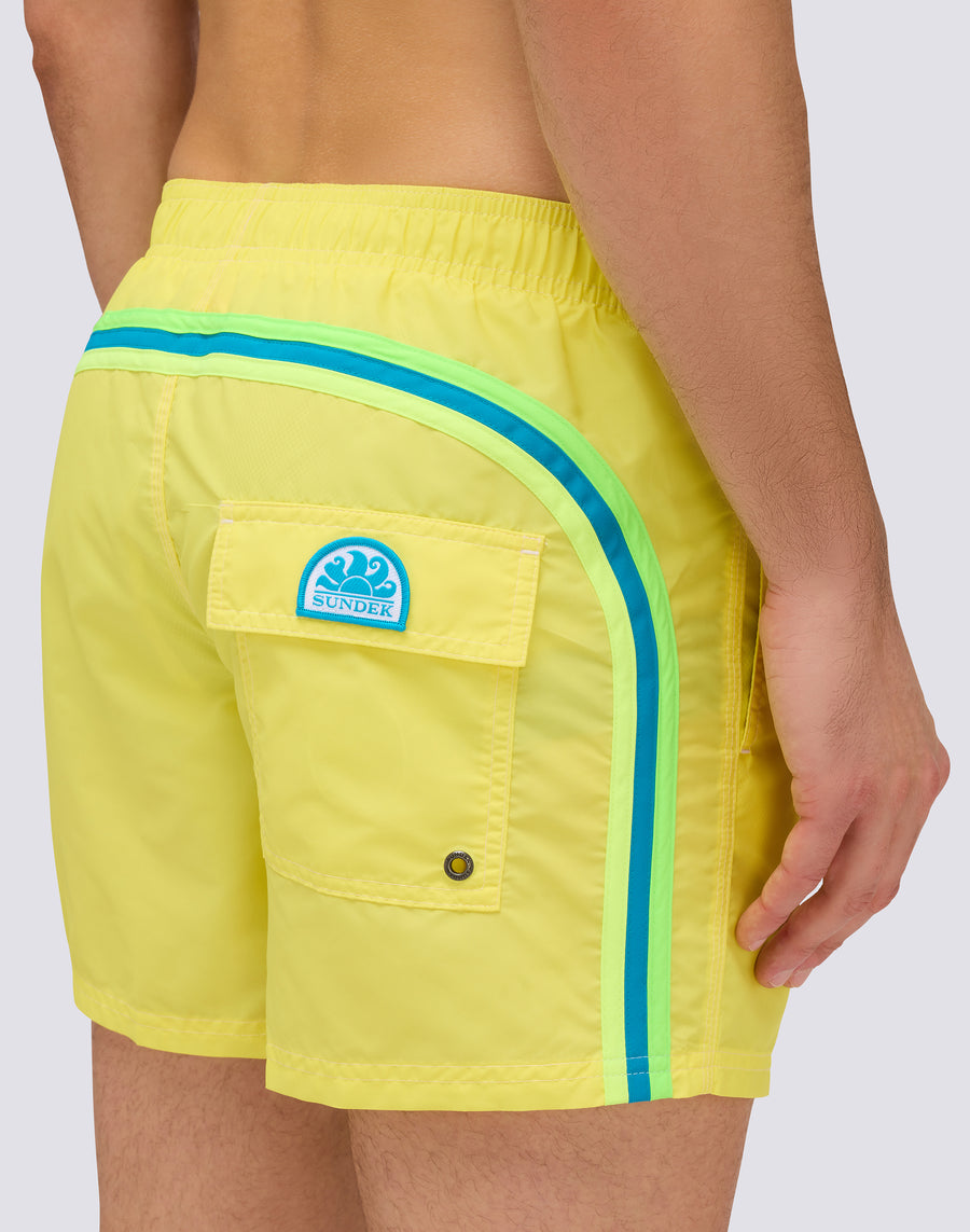 The M504BDTA100 men's short swimsuit embodies the essence of Sundek style: the perfect balance between iconic design, absolute comfort and quality. These elasticated waist beach shorts are the ideal companion for those seeking freedom of movement, quick drying and unmistakable style. Made from 100% nylon taffeta, the fabric that has made Sundek famous since 1958, these swim shorts offer a silky texture, exceptional lightness and extraordinary durability. Ultra-fast drying ensures immediate comfort, both in the waves and out of the water, allowing you to transition effortlessly from the beach to aperitif time. Featuring the unmistakable Sundek rainbow on the back, a symbol of the brand's authenticity and heritage, these swim shorts have an elasticated waist with an adjustable drawstring for a customised fit. The three-needle stitching ensures maximum strength and durability, even after countless sessions of surfing, swimming and sunbathing. Versatile and high-performance, perfect for surfing, swimming, beach volleyball and leisure, these men's swim shorts combine technical performance and casual style. The 35 cm length (in size M) offers a modern and sporty fit, ideal for those who love freedom of movement.