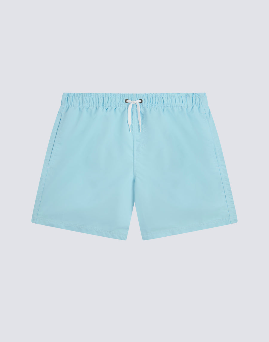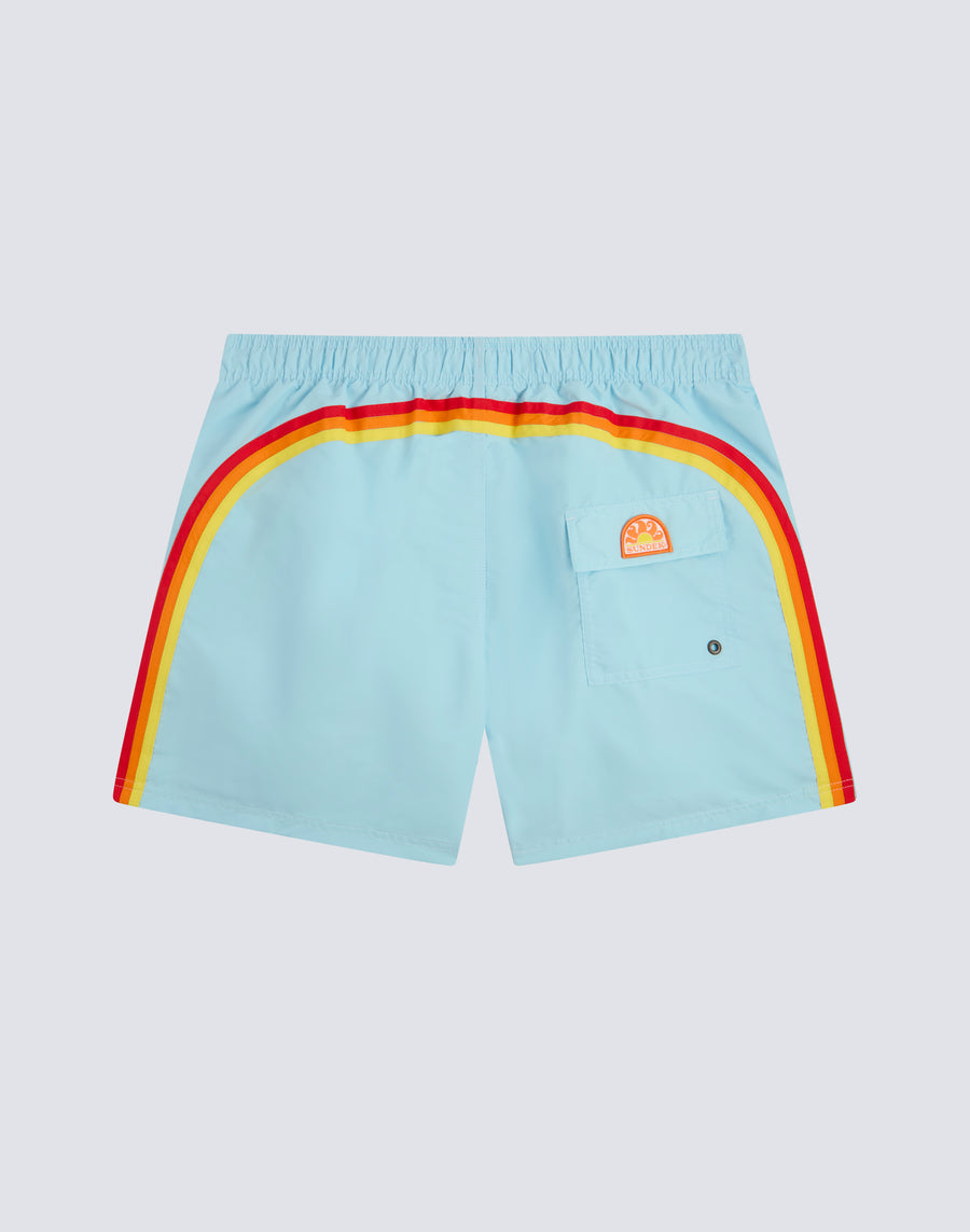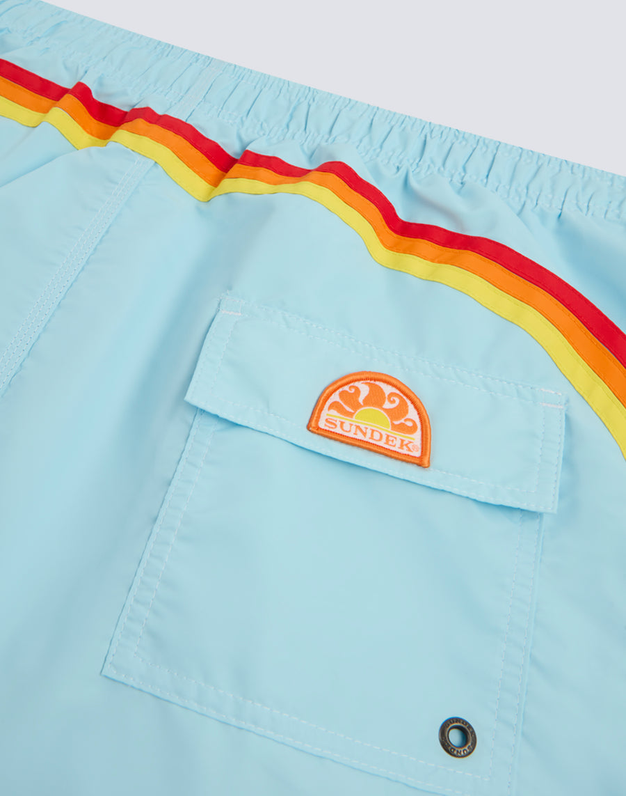Short men's swim shorts with elasticated waist, drawstring and iconic Sundek rainbow on the back. This swimsuit is made with three-needle stitching and 100% of our historic fabric, nylon-taffeta: smooth as silk, light and resistant to everything, it dries very quickly to give you comfort everywhere, in the waves and outside waterfall. Length 35 cm (size M), measured on the outside of the leg.