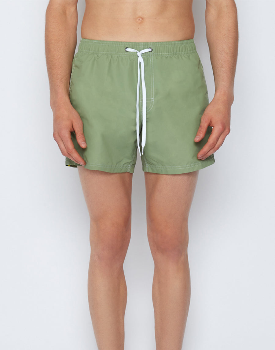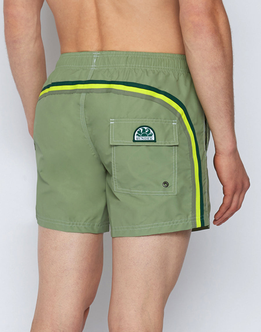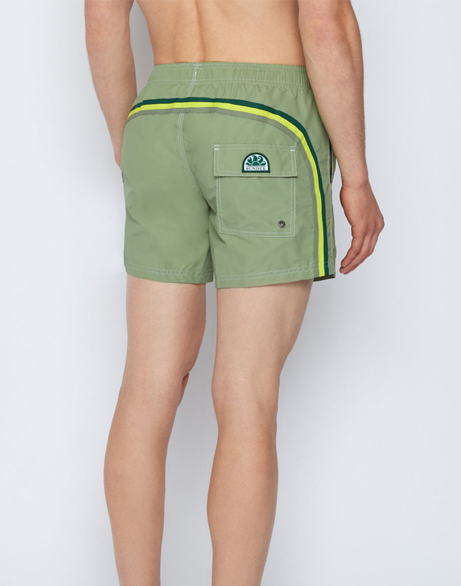 Short men's swim shorts with an elasticized waist, drawstring and iconic Sundek rainbow on the back. This swimsuit is made with three-needle stitching and 100 percent with our historic fabric, nylon-taffeta: silky smooth, lightweight and resistant to everything, it dries super fast to give you comfort everywhere, in the waves and out of the water. Length 35 cm (size M), measured on the outside of the leg.
