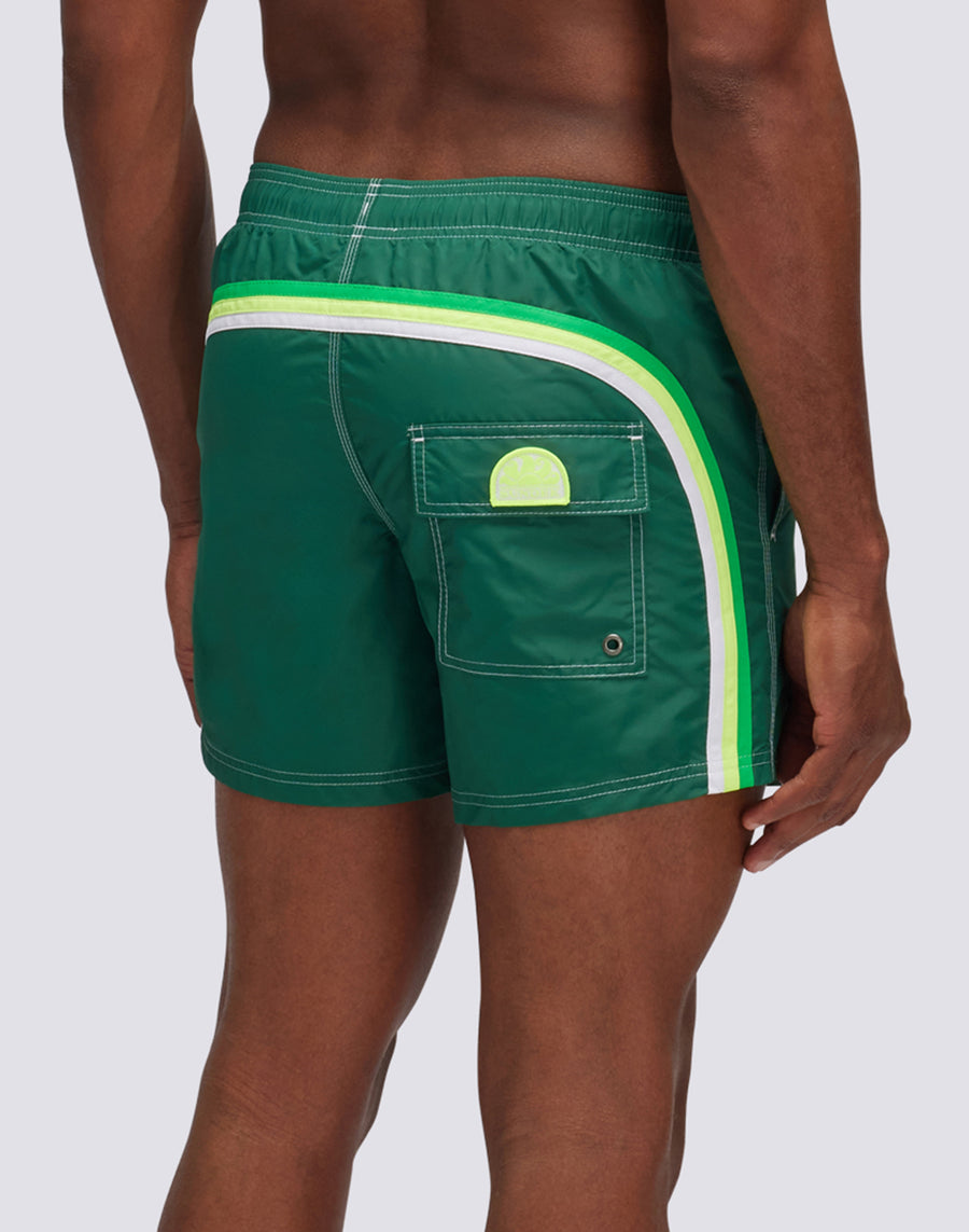 Short men's swim shorts with elasticated waist, drawstring and iconic Sundek rainbow on the back. This swimsuit is made with three-needle stitching and 100% of our historic fabric, nylon-taffeta: smooth as silk, light and resistant to everything, it dries very quickly to give you comfort everywhere, in the waves and outside waterfall. Length 35 cm (size M), measured on the outside of the leg.