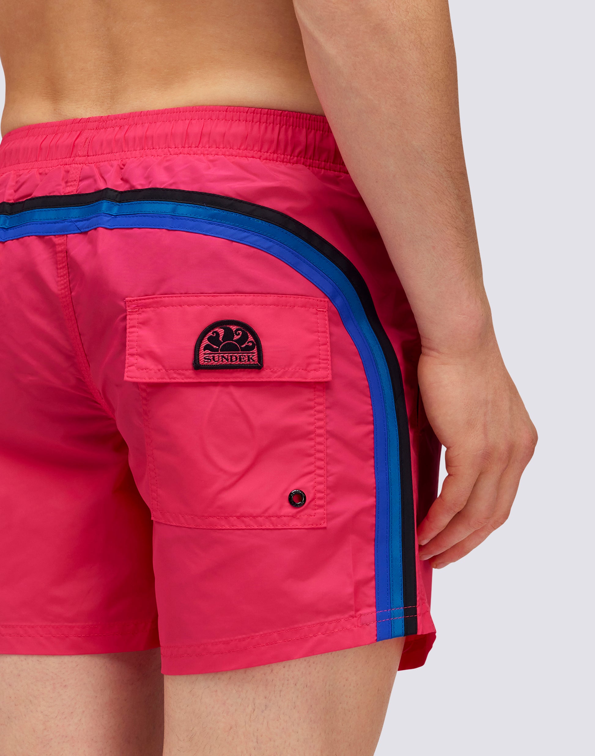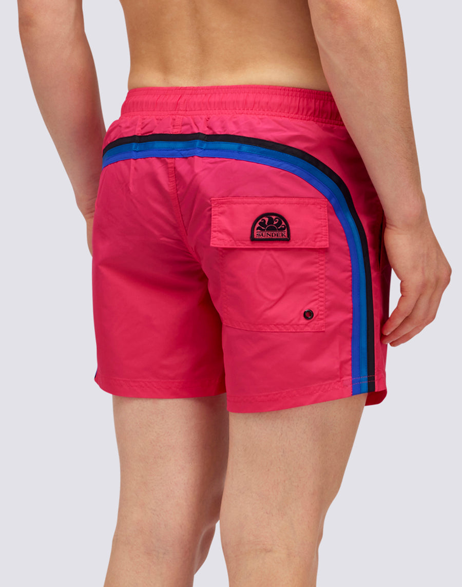Short men's swim shorts with elasticated waist, drawstring and iconic Sundek rainbow on the back in a dark version. This swimsuit is made with three-needle stitching and 100% of our historic fabric, nylon-taffeta: smooth as silk, light and resistant to everything, it dries very quickly to give you comfort everywhere, in the waves and outside waterfall. Length 35 cm (size M), measured on the outside of the leg.