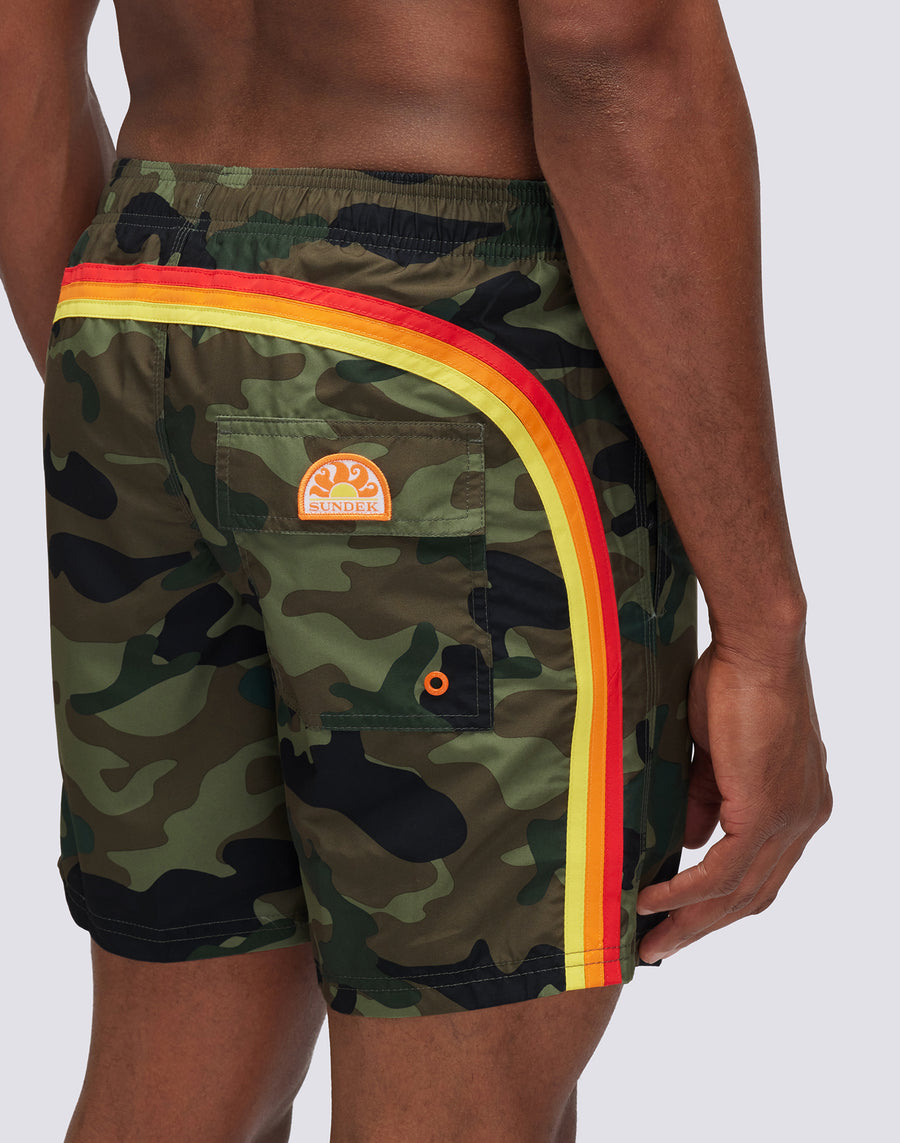 The camouflage print won't let your stretch-waisted Sundek medium swimming costume go unnoticed, comfortable and perfect thanks to the three-needle stitching that makes it super durable. Made of basic micropeach polyester, it features a small pocket on the back and the iconic Sundek rainbow.