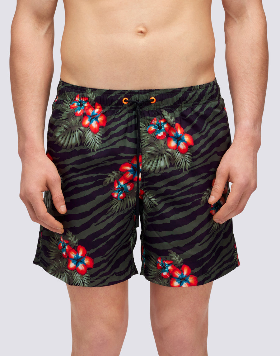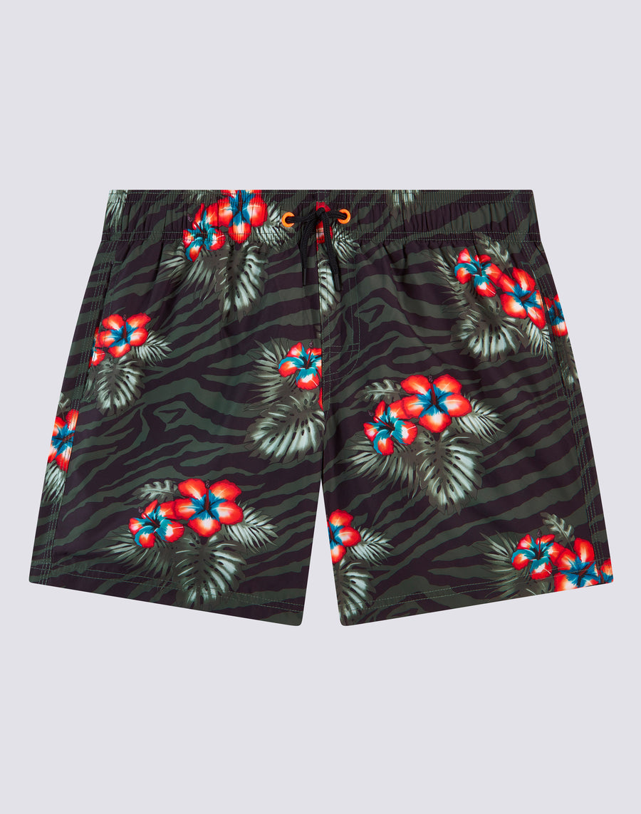 REPREVE® ELASTICATED WAIST MEDIUM SWIMSHORTS WITH JUNGLE HIBI PRINT