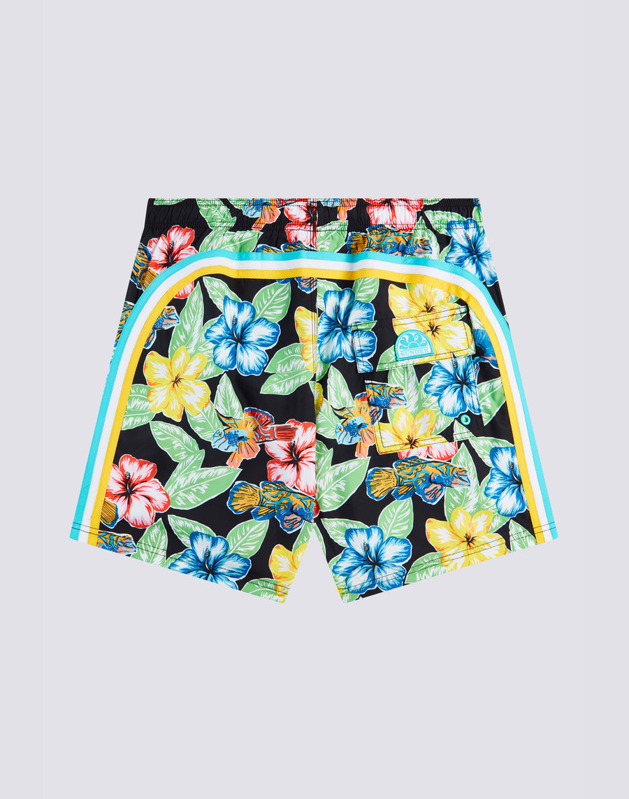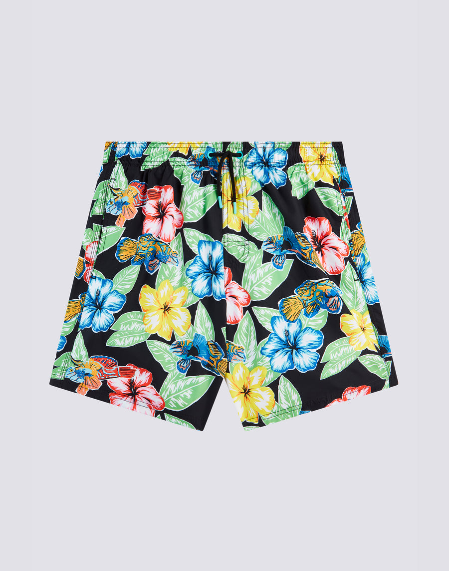 Swim trunks with elasticated drawstring waistband, in lightweight recycled repreve® fabric made of plastic bottles. Iconic rainbow detail on the back. Animal fish - archive print. Outseam 16"/41 cm (size m).
