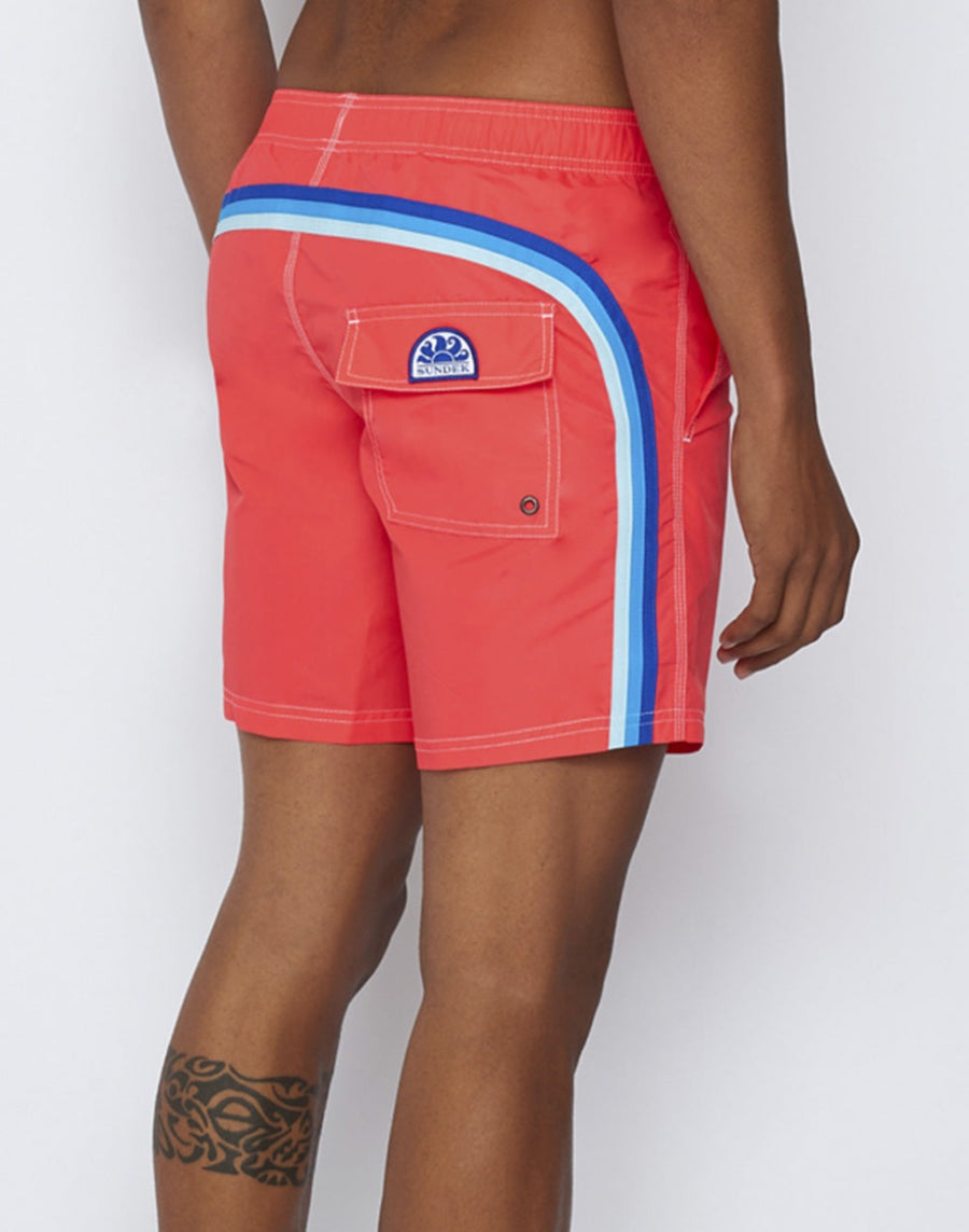 All of Sundek's timeless style in this mid-length boardshort with elasticated waist. Stylish, comfortable, destined to last holiday after holiday: it's our classic boardshort with drawstring waist and contrasting rainbow back, made in our historic lightweight, quick-drying, durable nylon taffeta fabric with three-needle stitching for extra reinforcement. Length 41 cm (size M), measured on the outside of the leg.