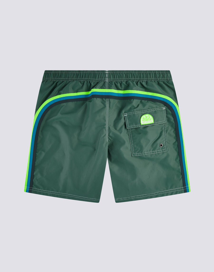 All of Sundek's timeless style in this mid-length, elastic-waisted boardshort. Stylish, comfortable, meant to last vacation after vacation: this is our classic boardshort with drawstring waist and contrasting rainbow back, made in our historic lightweight, quick-drying, durable nylon taffeta fabric with three-needle stitching for extra reinforcement. Length 41 cm (size M), measured on the outside of the leg.
