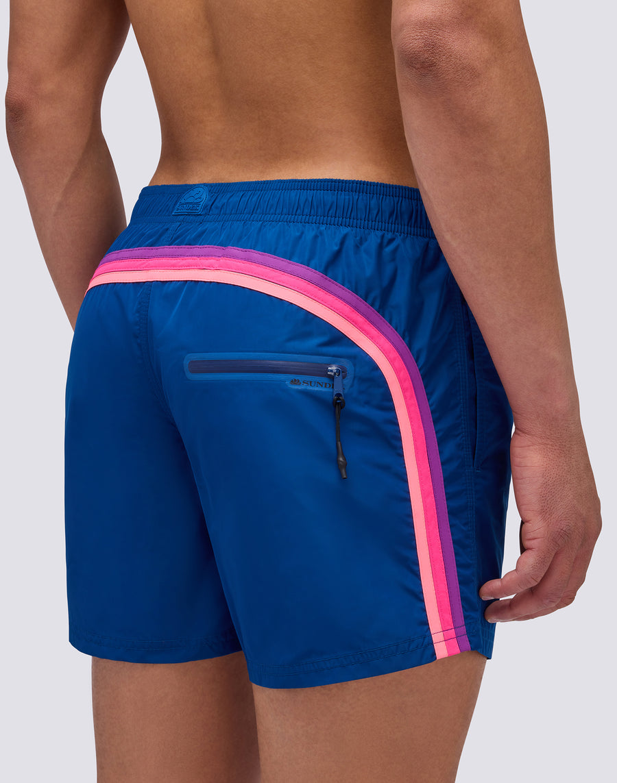 Short men's swimsuit in solid color with bright colors and the detail of the heat-sealed zip that closes the back pocket. Lightweight, resistant, dries very quickly and is made of memory polyester, a technical fabric that maintains its shape over time. It has our classic three-needle stitching that increases durability and our iconic rainbow on the back.