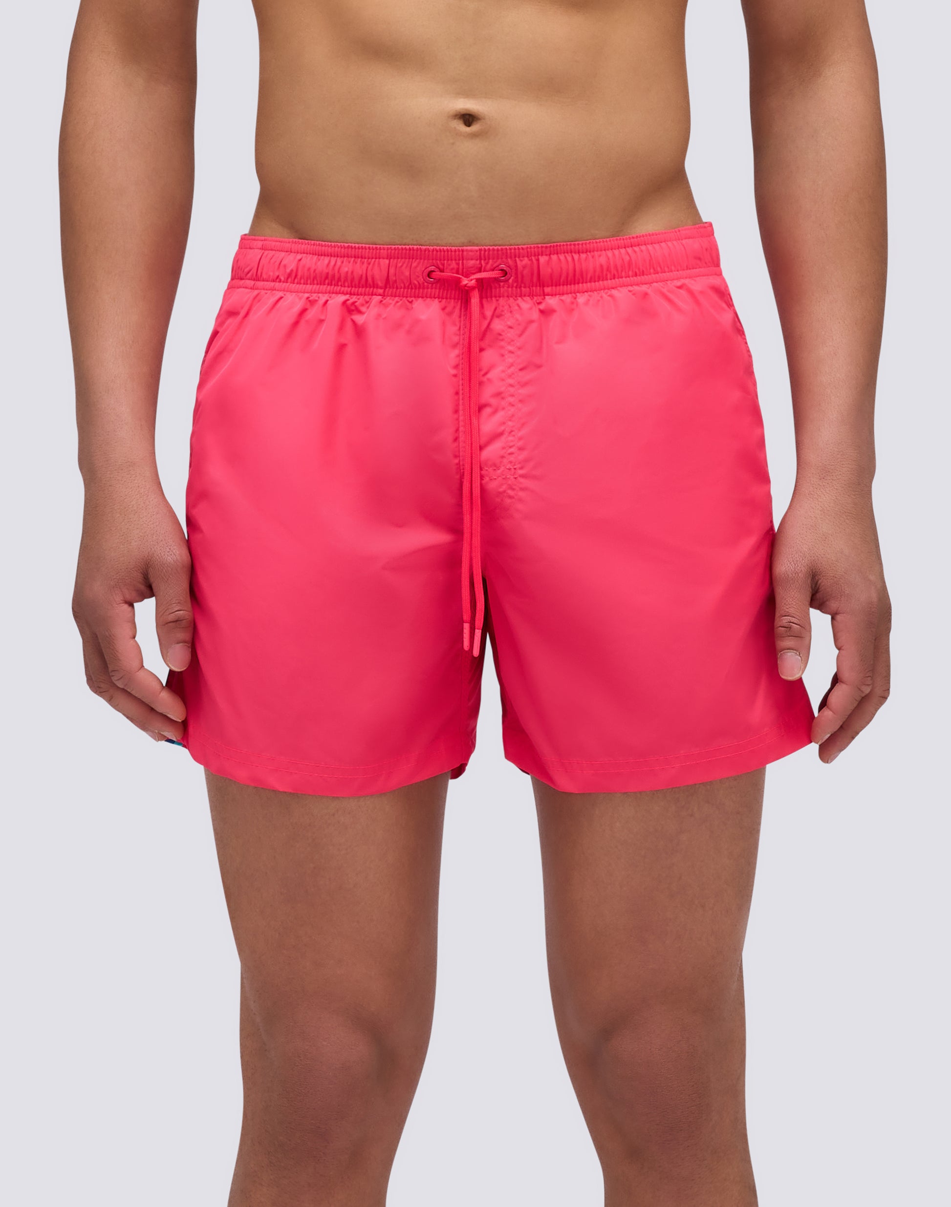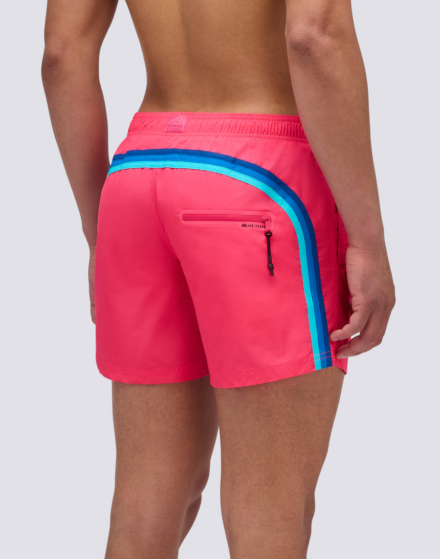 Short men's swimsuit in solid color with bright colors and the detail of the heat-sealed zip that closes the back pocket. Lightweight, resistant, dries very quickly and is made of memory polyester, a technical fabric that maintains its shape over time. It has our classic three-needle stitching that increases durability and our iconic rainbow on the back.