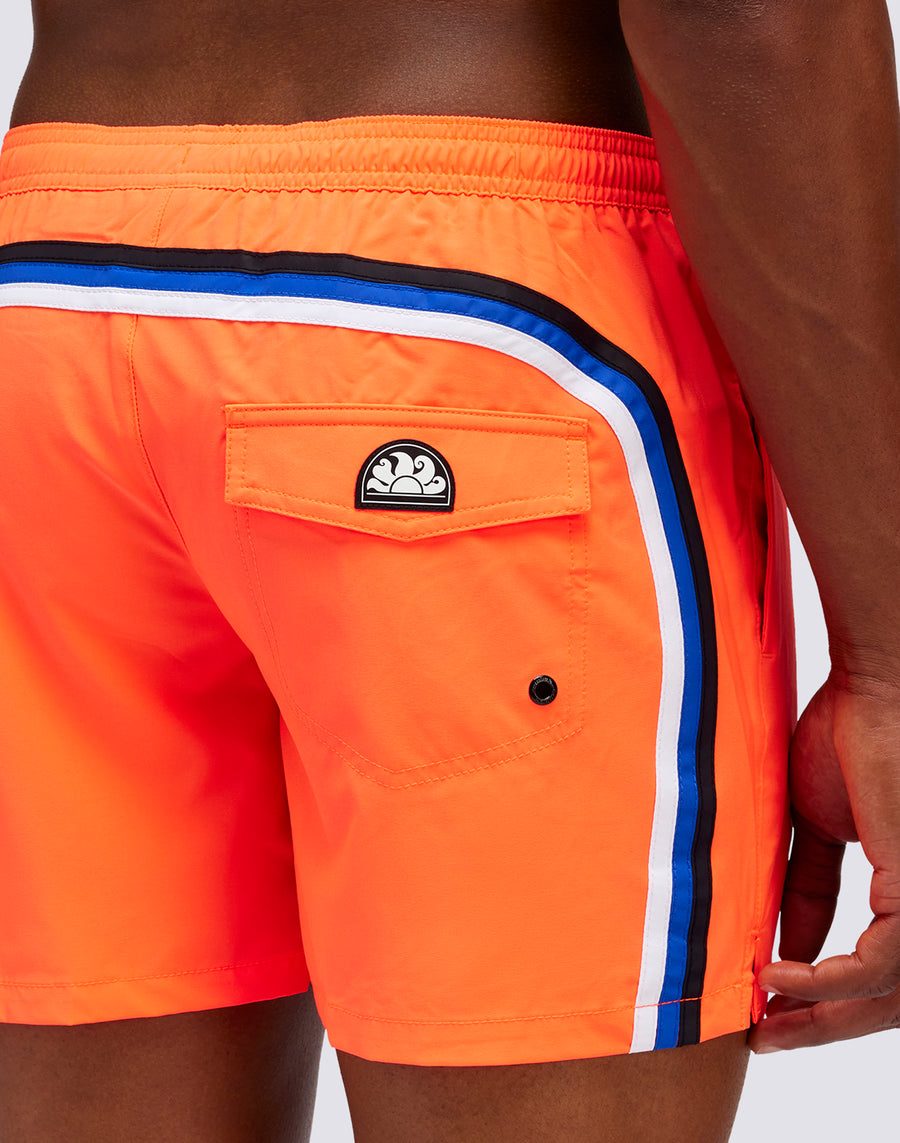 Follow the waves with the short men's swimsuit with an elastic waist in solid color and bright colours. Lightweight, resistant, dries very quickly and is made of 4 Way Stretch fabric. It has our classic three-needle stitching that increases durability and our iconic rainbow on the back.