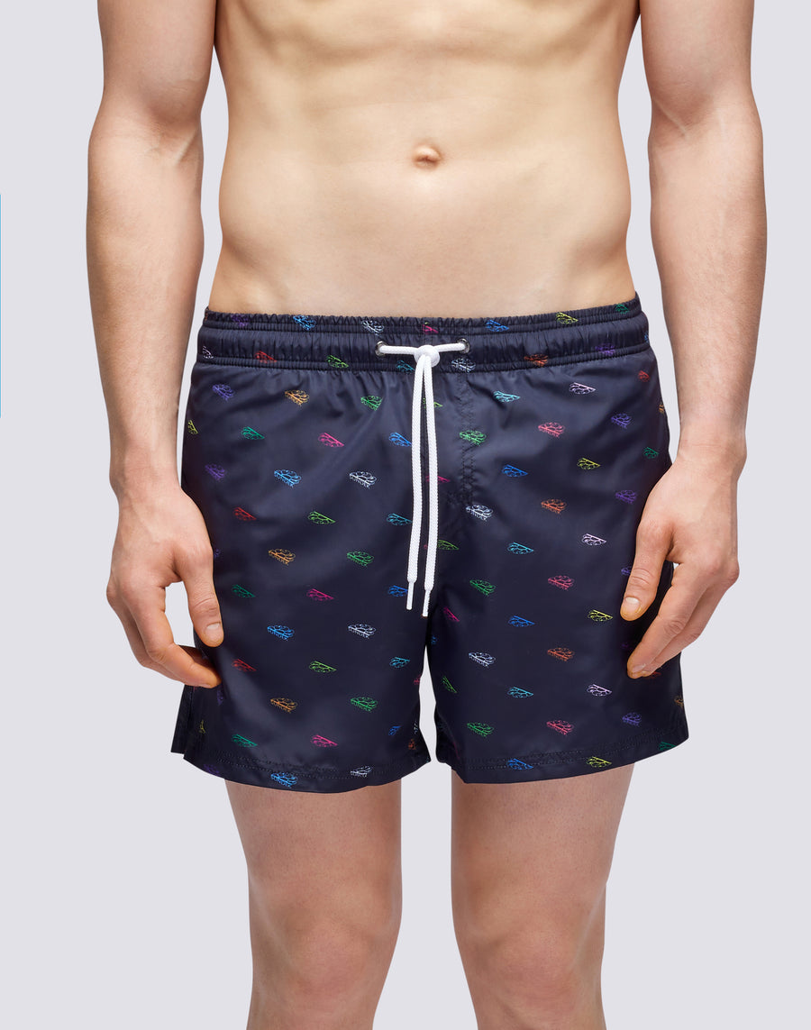 Ready to ride the next wave with this short men's swimsuit with an elasticated waist and monogram print. Made of lightweight recycled polyester, it guarantees grip and comfort thanks to the presence of the drawstring and elastic waist. Length 14”/35 cm (in size M).