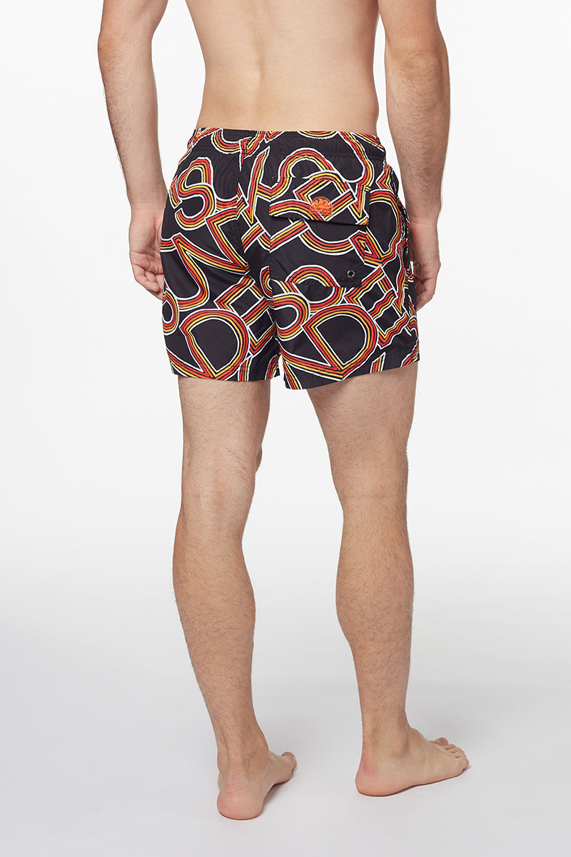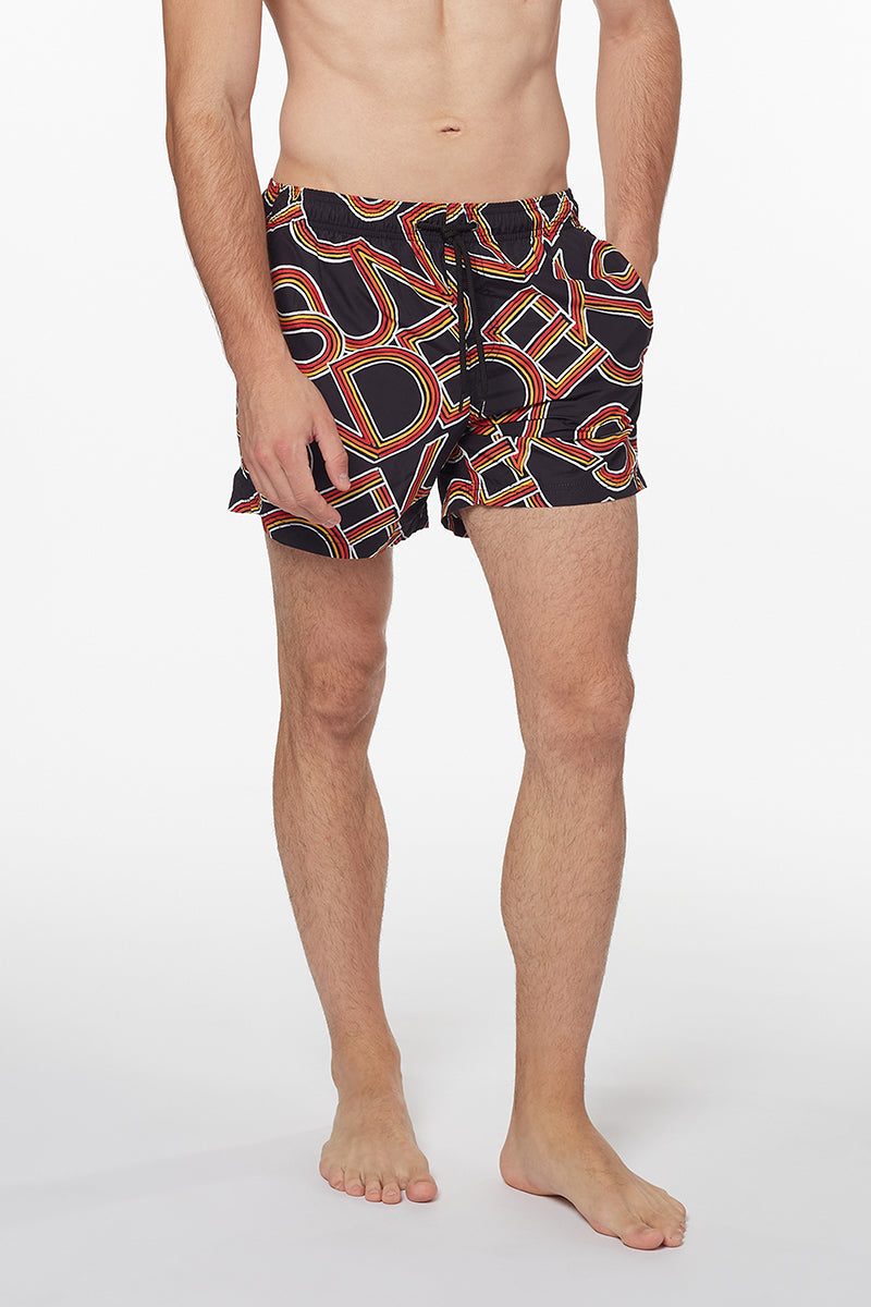 Ready to ride the next wave with this short men's swimsuit with elasticated waist and payoff print. Made of light recycled polyester, it guarantees adherence and comfort thanks to the presence of the drawstring and the elastic waistband. Length 4”/35cm (in size M).