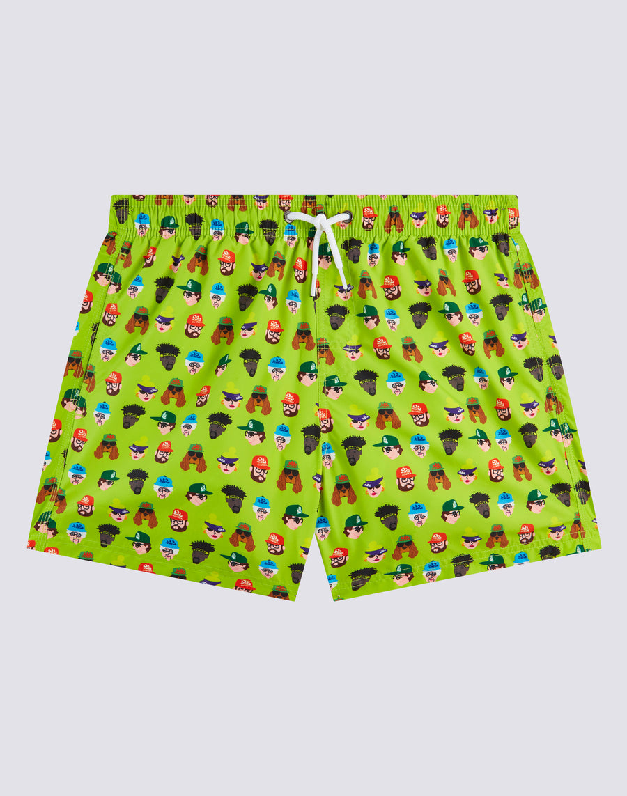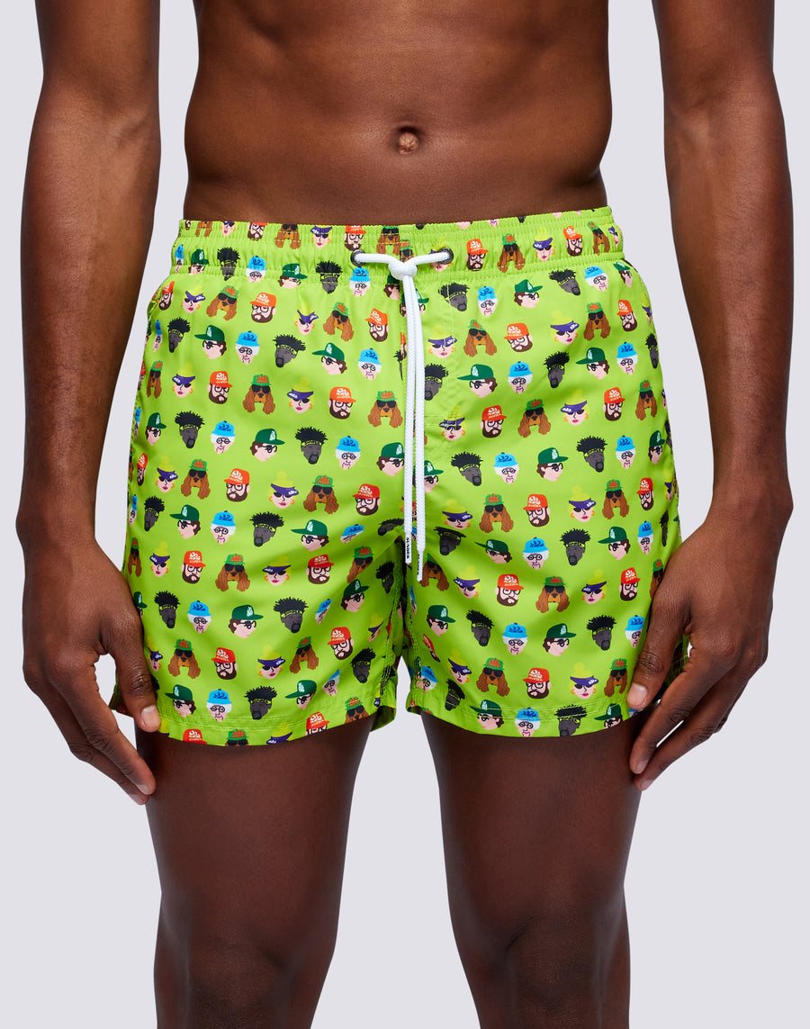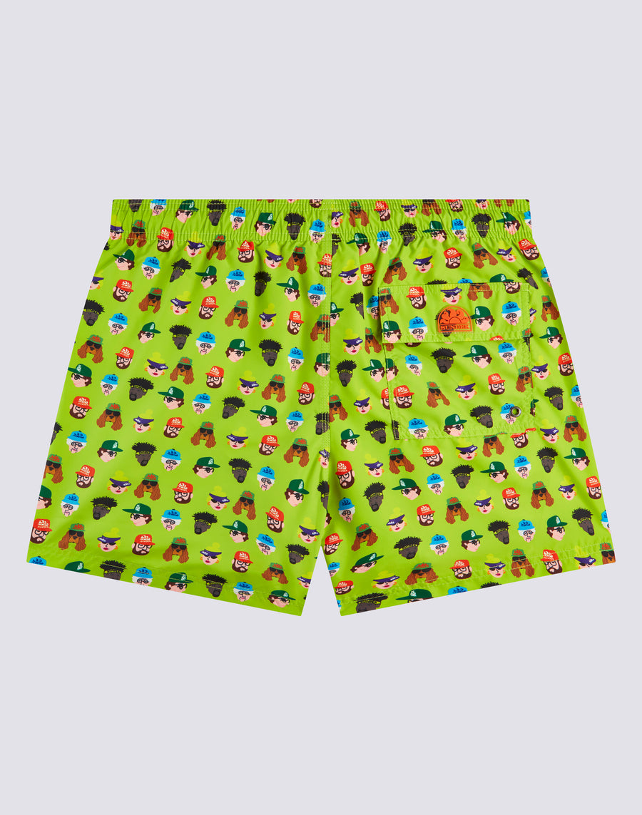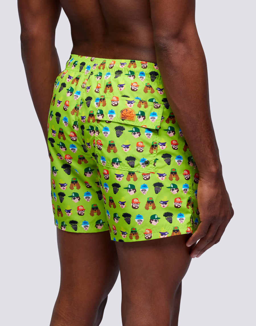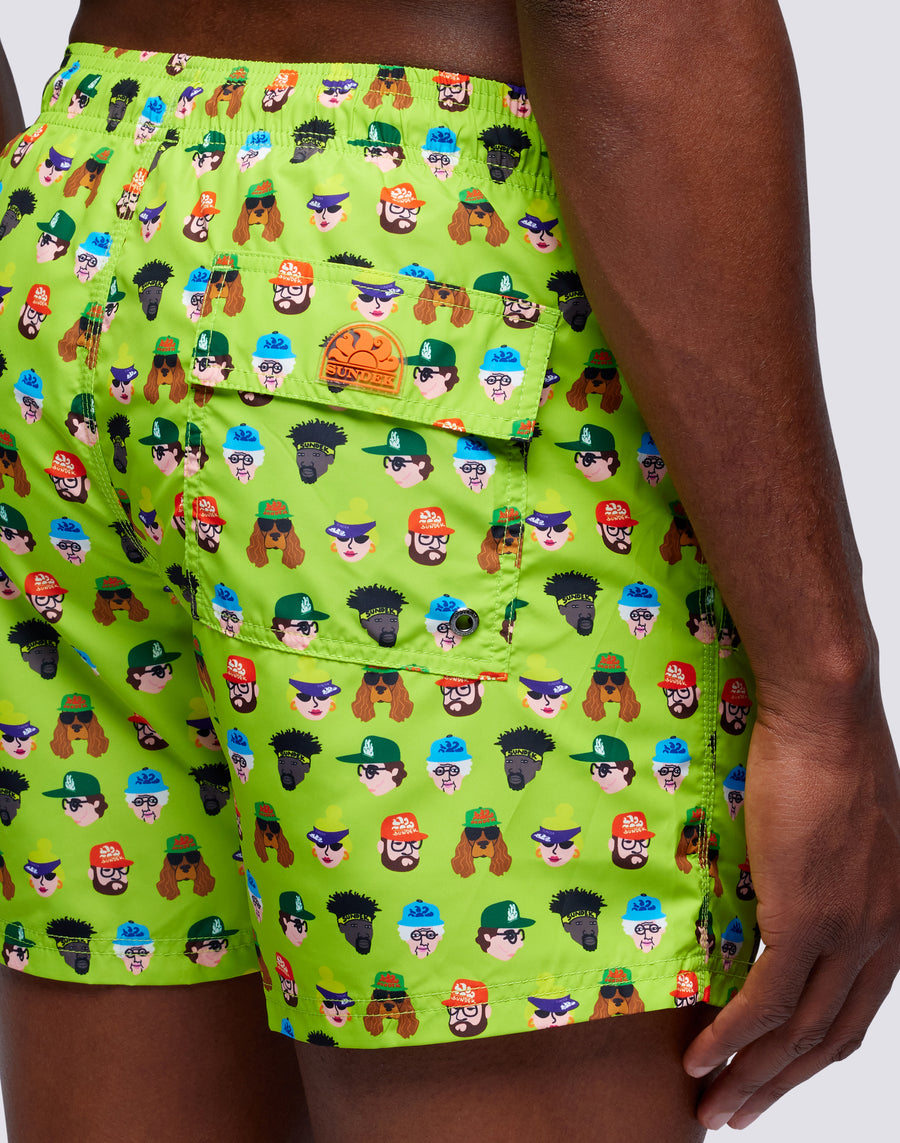 Swim trunks with elasticated drawstring waistband, in lightweight recycled polyester fabric. Guess Who print. Outseam length 14"/35 cm (size m).