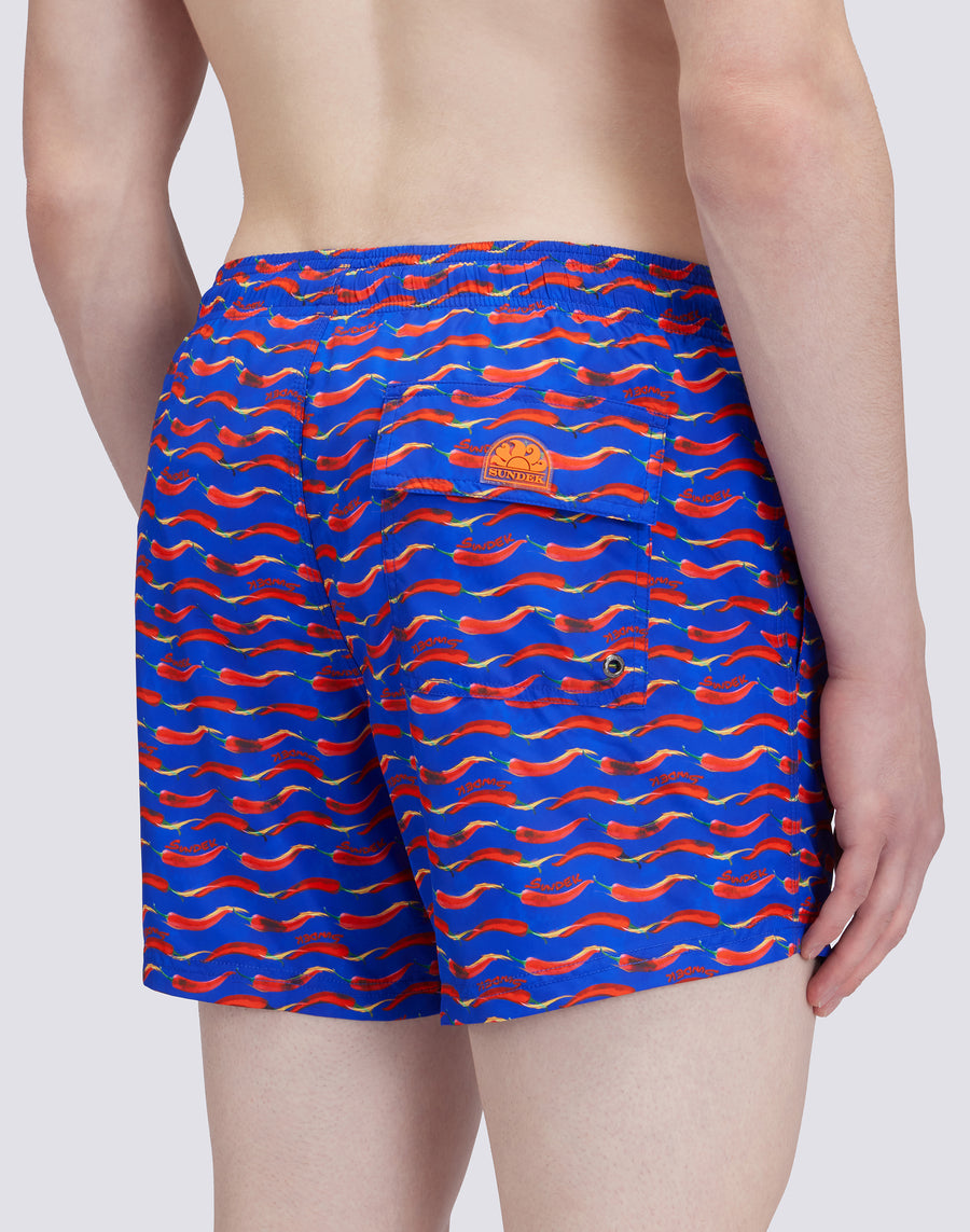 Ready to ride the next wave with this short men's swimsuit with an elastic waist and Chilino print. Made of lightweight recycled polyester, it guarantees grip and comfort thanks to the presence of the drawstring and elastic waist. Length 14”/35 cm (in size M).