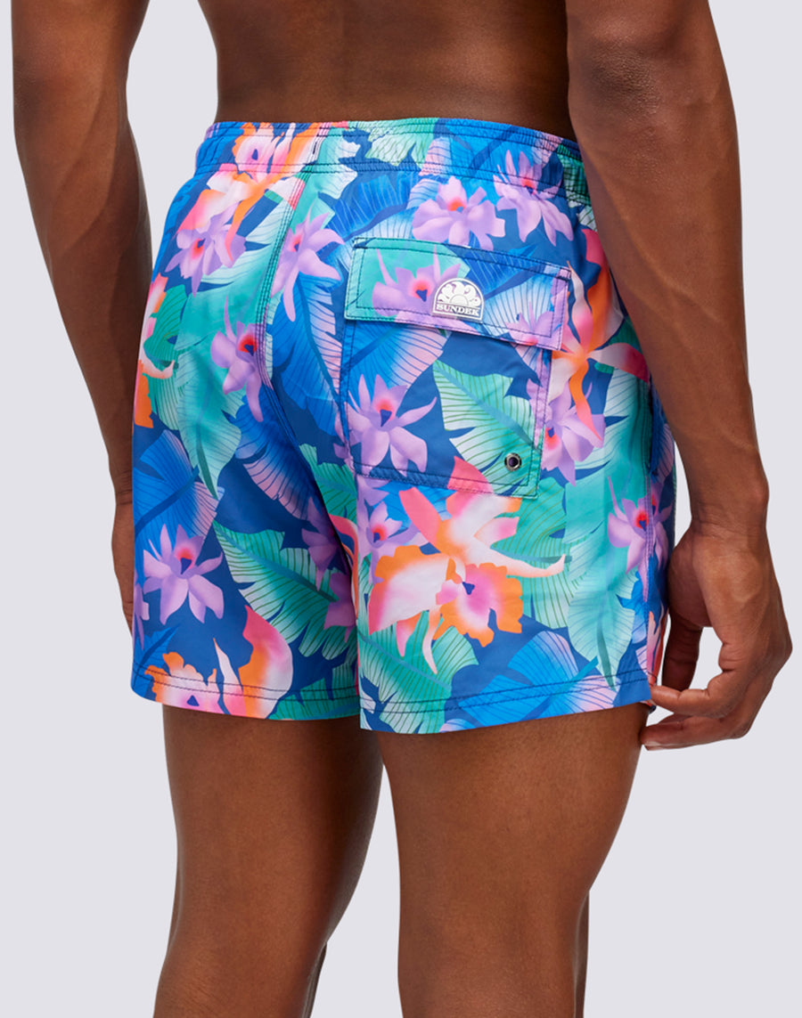 Ready to ride the next wave with this vorto men's swimsuit with an elasticated waist and colorful Orchid Party print. Made of lightweight recycled polyester, it guarantees a snug fit and comfort thanks to the presence of the drawstring and elastic waistband. Length 14”/35 cm (in size M).