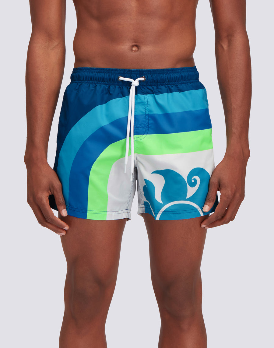 Men's swimshorts with elasticated drawstring waist, in lightweight Repreve® fabric recycled from plastic bottles. Iconic rainbow detail on the back. Sun colors print. Outer thigh length 14"/35 cm (size M).