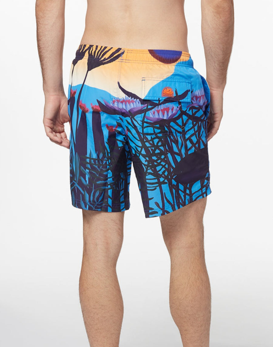 Ready to ride the next wave with this mid-length men's swimsuit with elasticated waist and dreamy print. Made of light recycled polyester, it guarantees adherence and comfort thanks to the presence of the drawstring and the elastic waistband. Length 16”/41 cm (in size M).