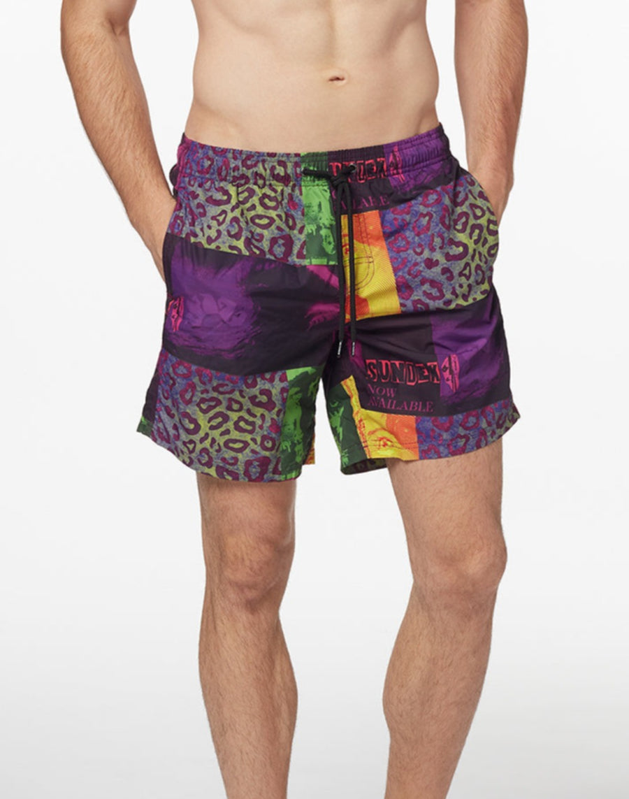 Get ready to ride the next wave in this Zine print mid-rise elasticated waist men's swim trunks. Made of light recycled polyester, it guarantees adherence and comfort thanks to the presence of the drawstring and the elastic waistband. Length 16”/41 cm (in size M).