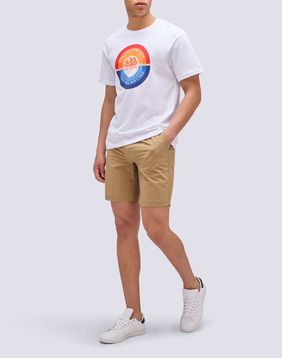 Men's cotton T-shirt with short sleeves and a very bright and colorful round front print, with the writing SUNDEK FOLLOW THE SUN. For your Spring/Summer outfits, pair with Bermuda shorts, long trousers or, why not, over your favorite boardshorts.