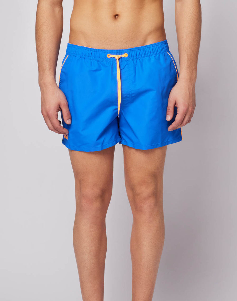 Coltrane short swimsuit with elasticated waist and contrasting piping on the front. The swimsuit features a drawstring and back pocket with velcro closure, as well as triple stitching on the areas of greatest stress to ensure optimal resistance. Length on outside leg 13"/33 cm (in size M).