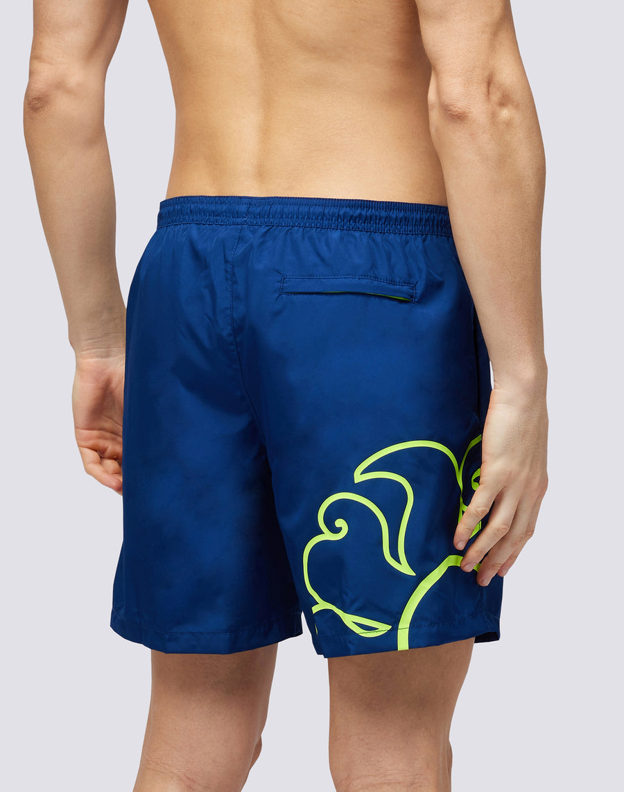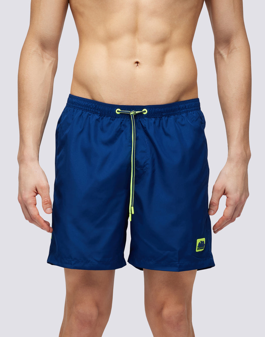 Swim shorts for men, medium length, elasticated waist. Equipped with drawstring and back zip pocket. It dries quickly thanks to the lightweight polyester with which it is made. Outer leg length 16"/41 cm (in size M).