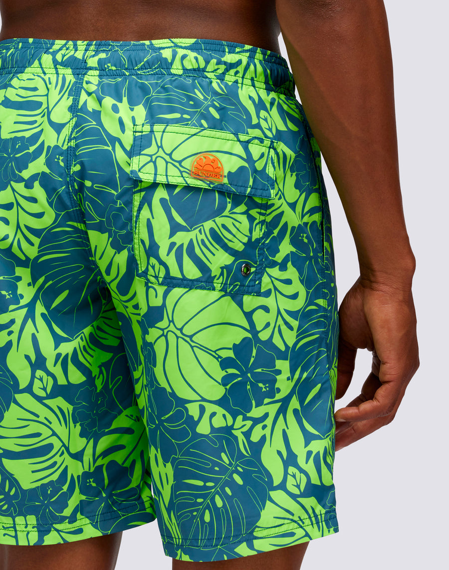 LONG SWIMSHORTS WITH ELASTIC WAIST LEAF POWER PRINT