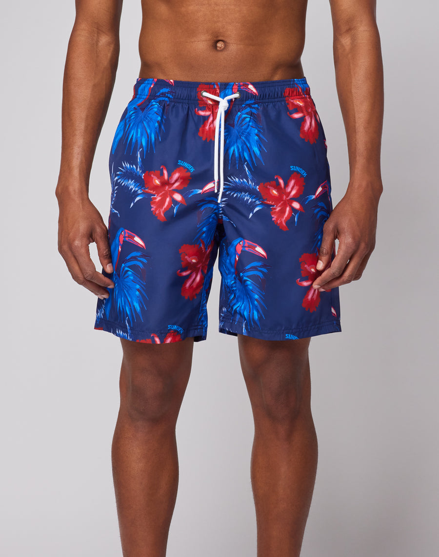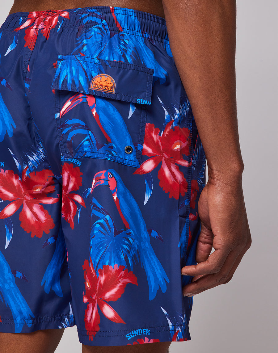 LONG BOARDSHORT WITH ELASTICATED WAIST AND TOUCANTRIP PRINT