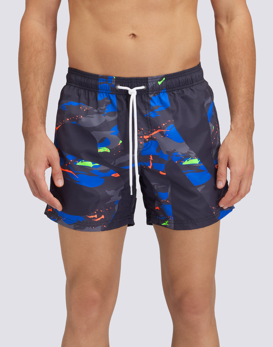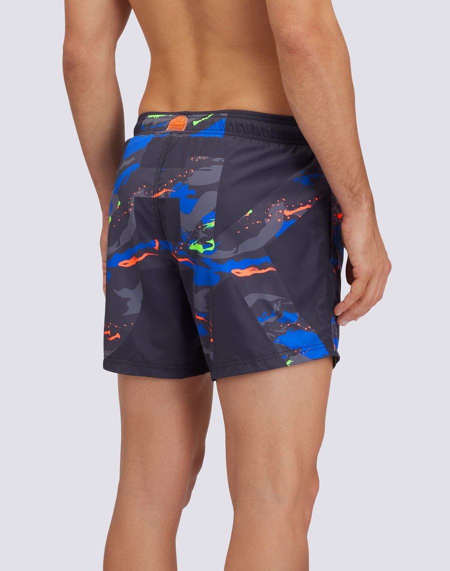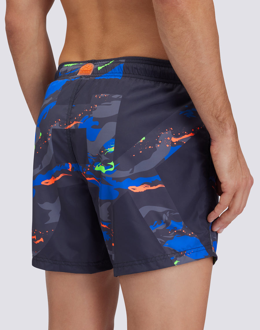 Men's swimshorts with elasticated drawstring waist, in lightweight Repreve® fabric recycled from plastic bottles. Iconic rainbow detail on the back. Macro logo print. Outer thigh length 14"/35 cm (size M).