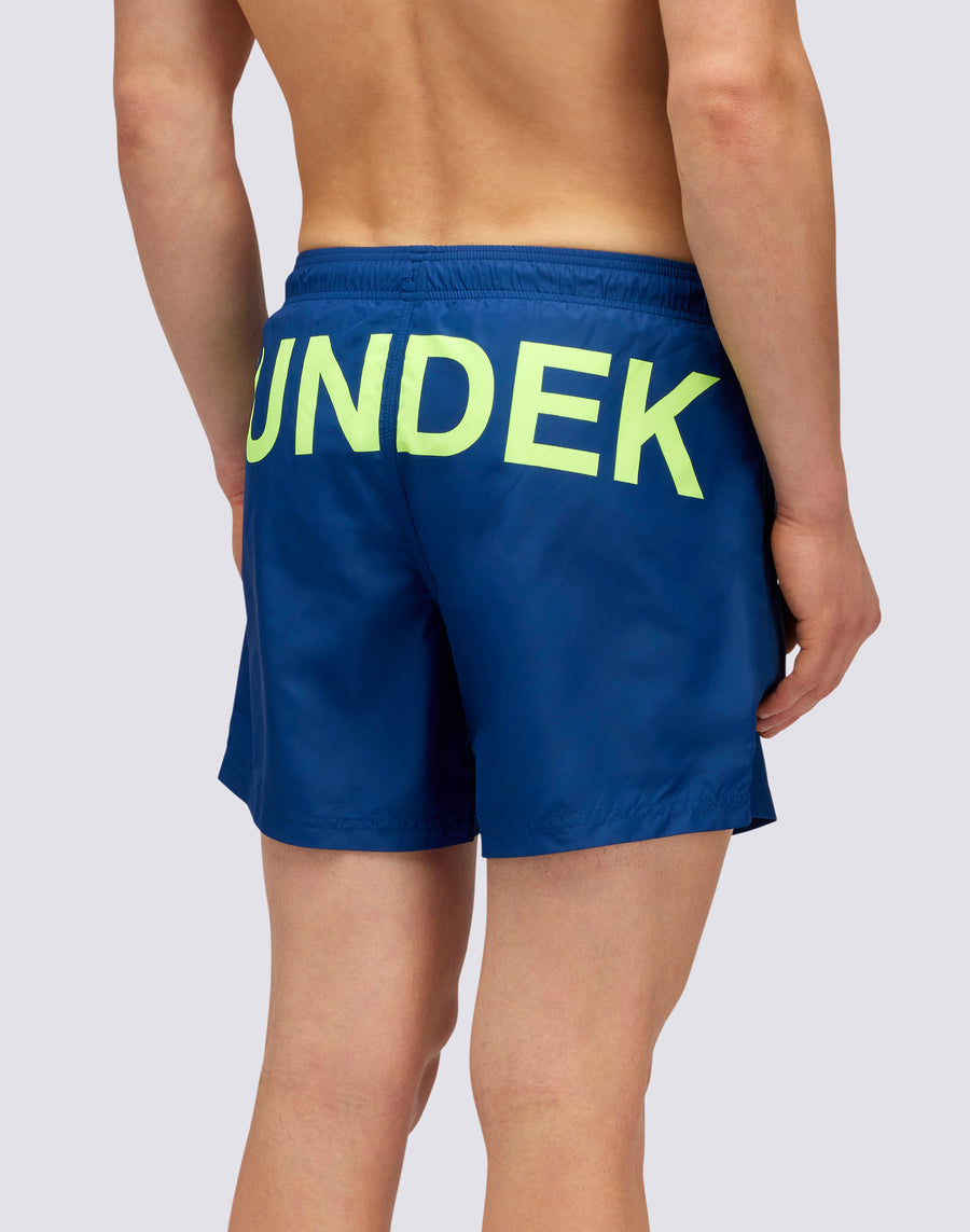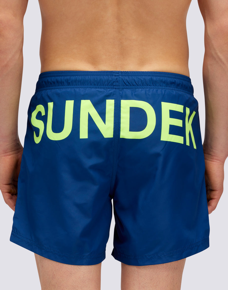 Express DNA Sundek. Solid color elastic waist short swimsuit with SUNDEK print on the back. The 3-needle stitching offers high resistance over time. Recycled polyester fabric.
