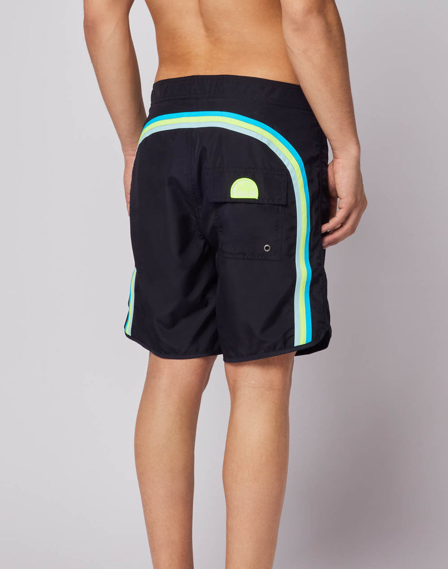 Medium men's swim trunks with fixed waist, drawstring and iconic Sundek rainbow on the back. This swimsuit is made with three needle stitching on the most stressed area for maximum strength. The fabric chosen is a lightweight polyester, to give you comfort everywhere, in the waves and out of the water. Low rise fit. Length 18"/46 CM (in size 32).