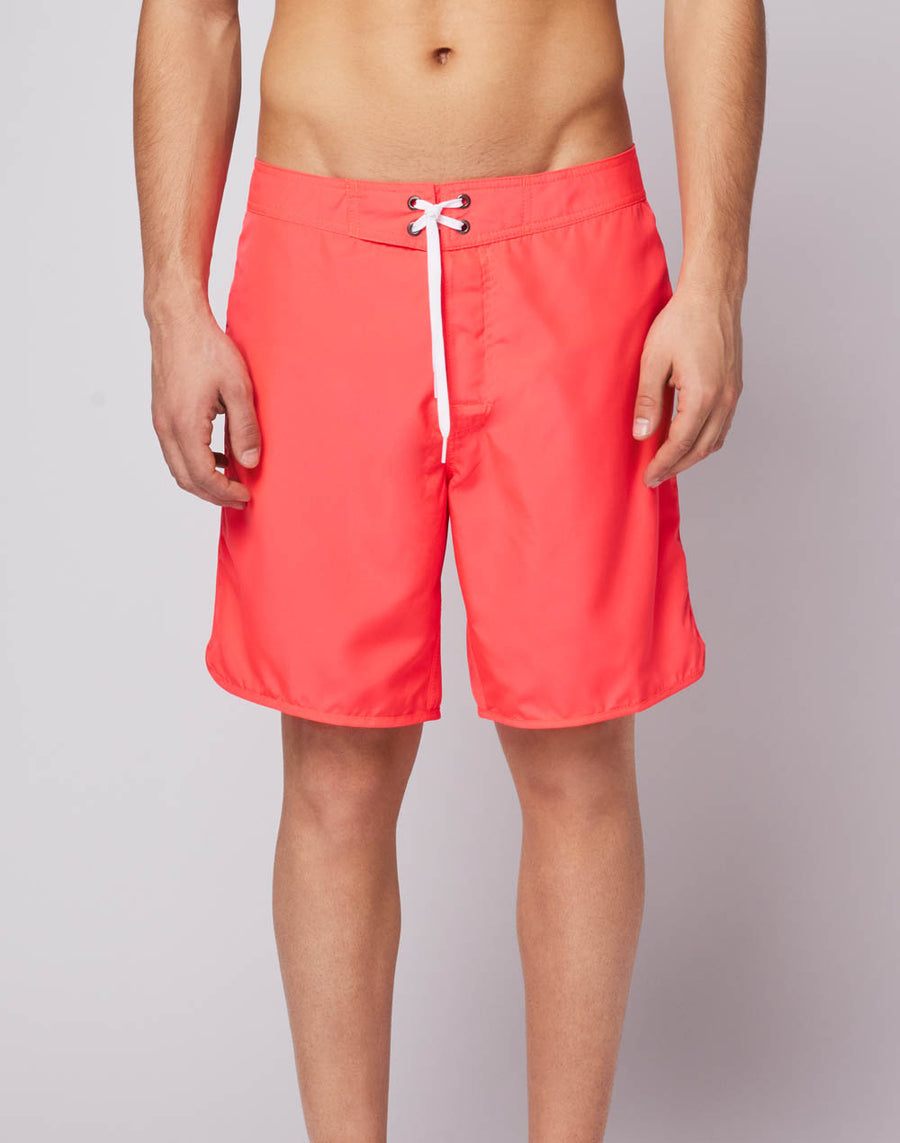 Long men's swim trunks with fixed waist, drawstring and iconic Sundek rainbow on the back. This swimsuit is made with three needle stitching on the most stressed area for maximum strength. The fabric chosen is a lightweight polyester, to give you comfort everywhere, in the waves and out of the water. Low rise fit. Length 18"/46 CM (in size 32).