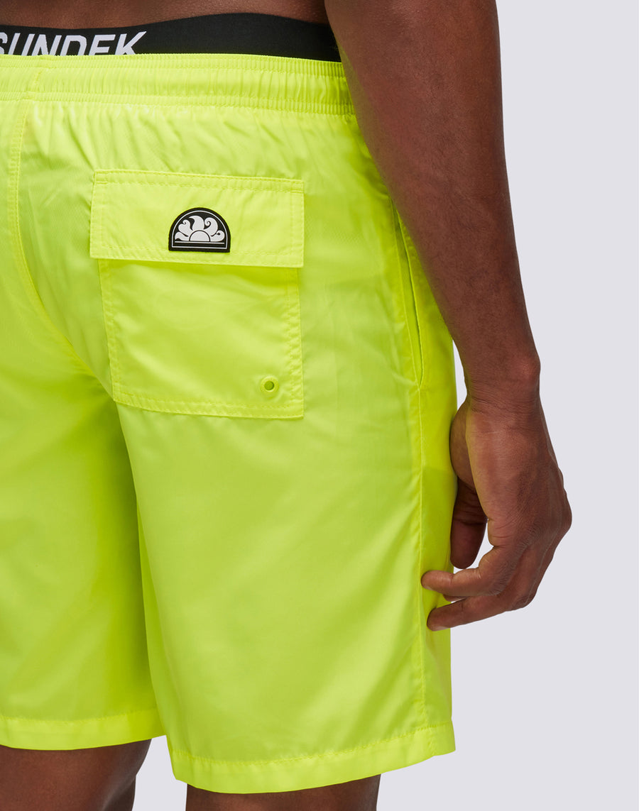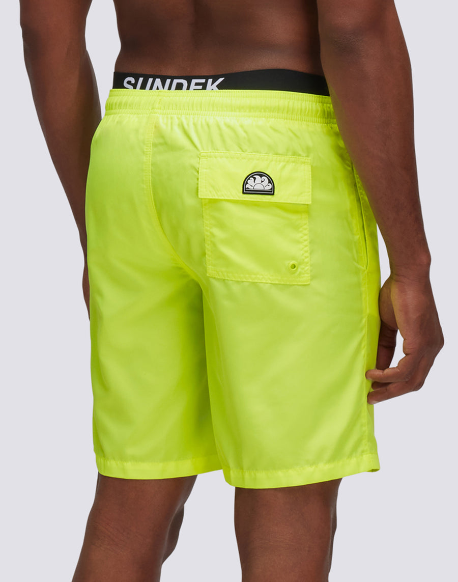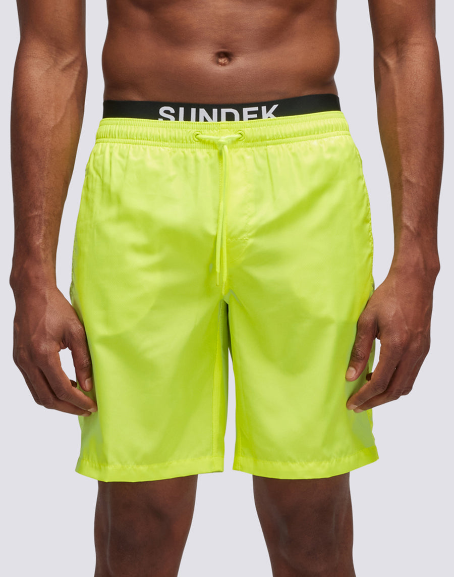 Embodying the Sundek spirit, wear this plain-colored long swimsuit with branded logo elastic. Also features side pockets, back pocket and drawstring to adjust the fit. The lightweight polyester from which it is made gives freshness and quick drying. Length on the outside leg 18"/46 cm (in size M).