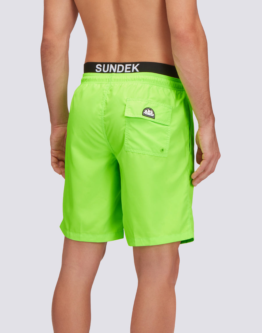 Embodying the Sundek spirit, wear this plain-colored long swimsuit with branded logo elastic. Also features side pockets, back pocket and drawstring to adjust the fit. The lightweight polyester from which it is made gives freshness and quick drying. Length on the outside leg 18"/46 cm (in size M).