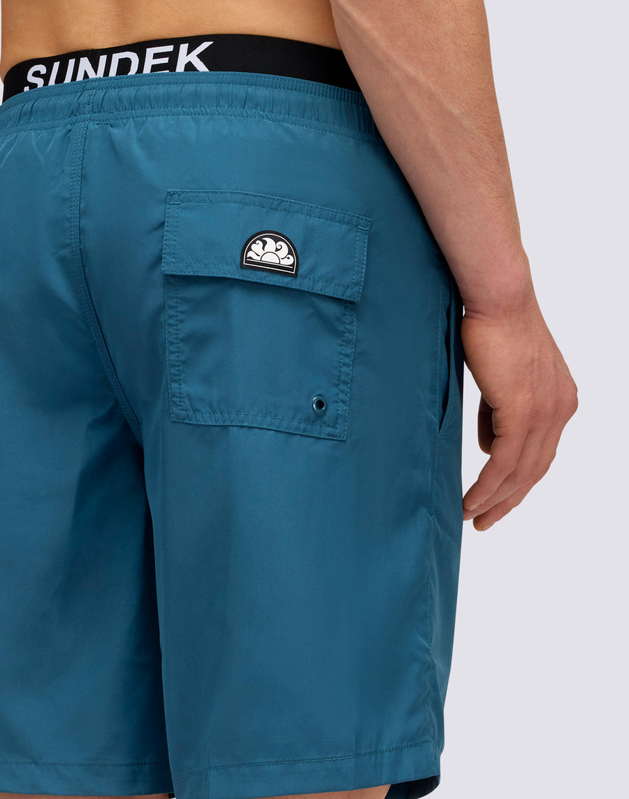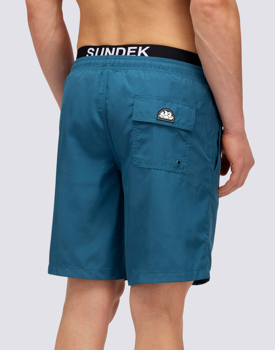 Embodying the Sundek spirit, wear this plain-colored long swimsuit with branded logo elastic. Also features side pockets, back pocket and drawstring to adjust the fit. The lightweight polyester from which it is made gives freshness and quick drying. Length on the outside leg 18"/46 cm (in size M).