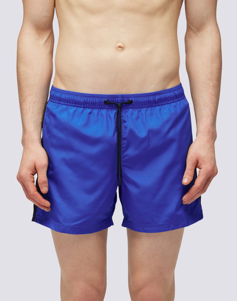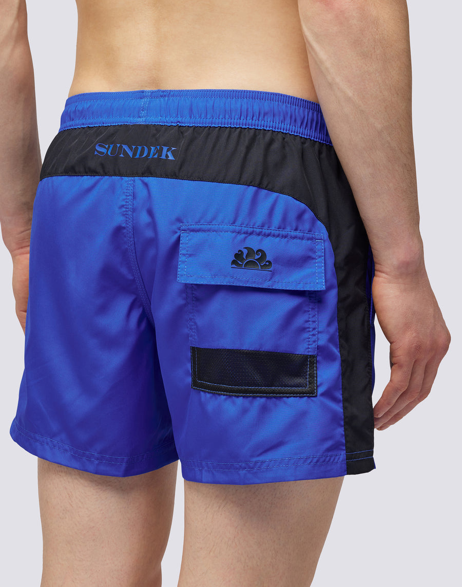 Short men's swimsuit with elasticated waist. Equipped with drawstring, elastic logo waist and back pocket with velcro. It dries quickly thanks to the lightweight polyester with which it is made. Outer leg length 14"/35 cm (in size M).