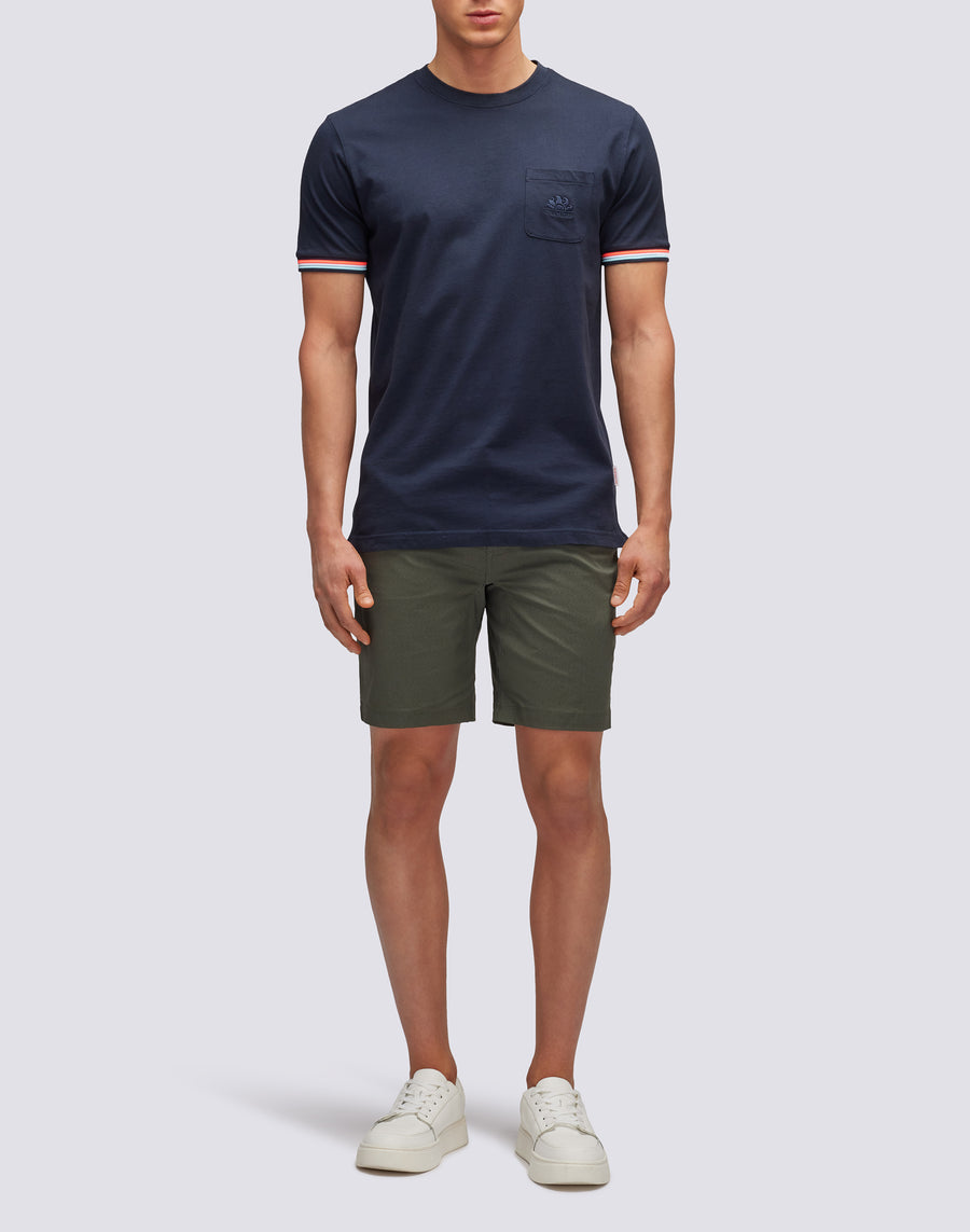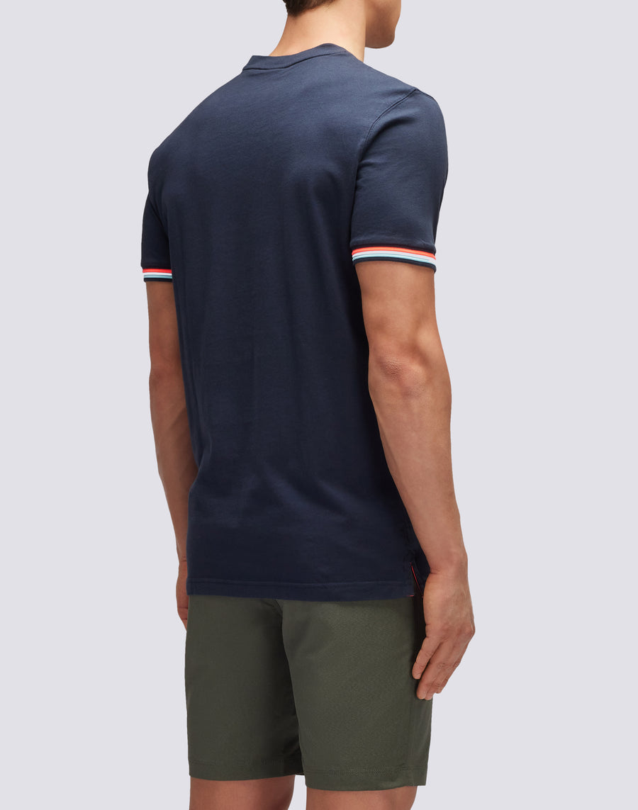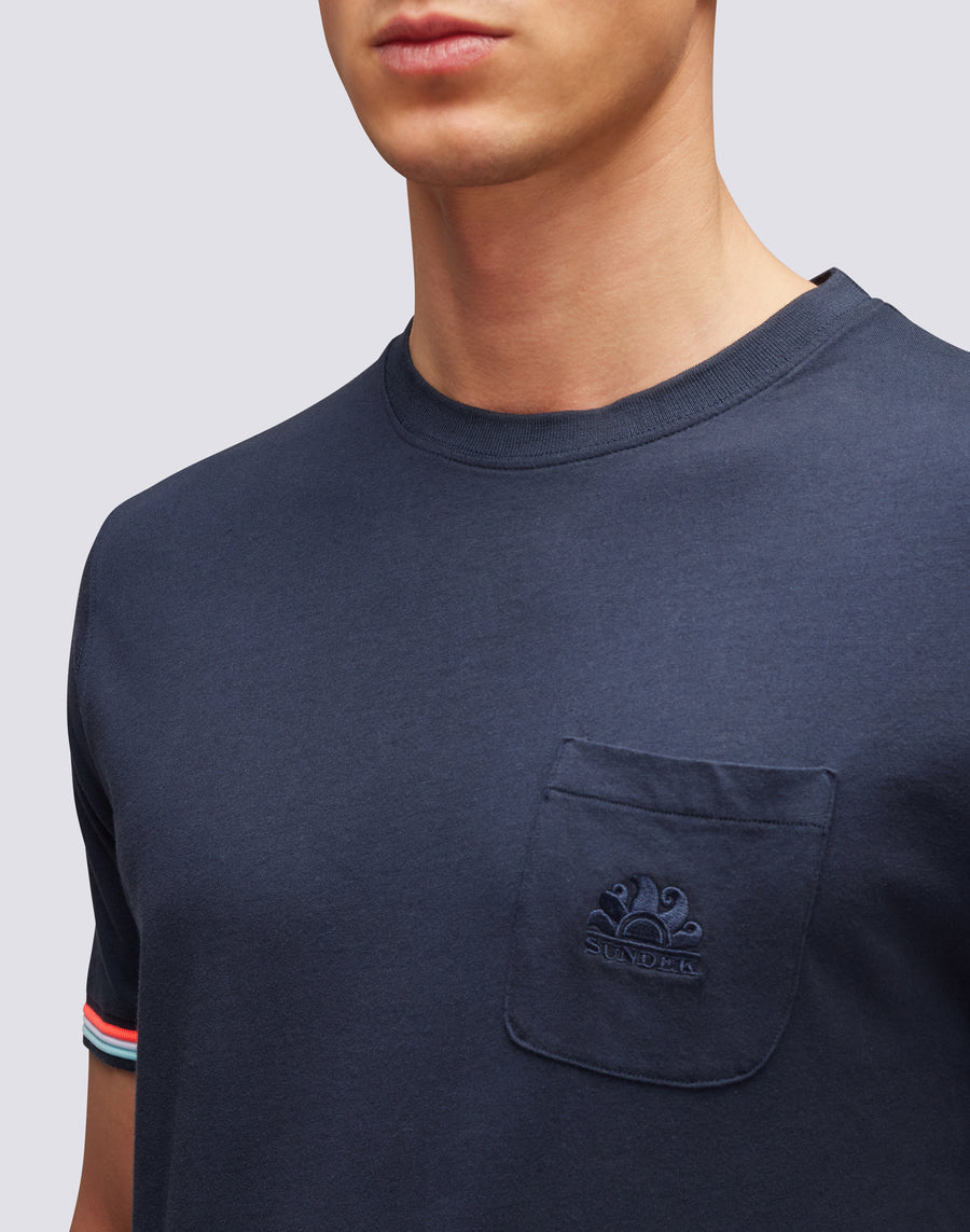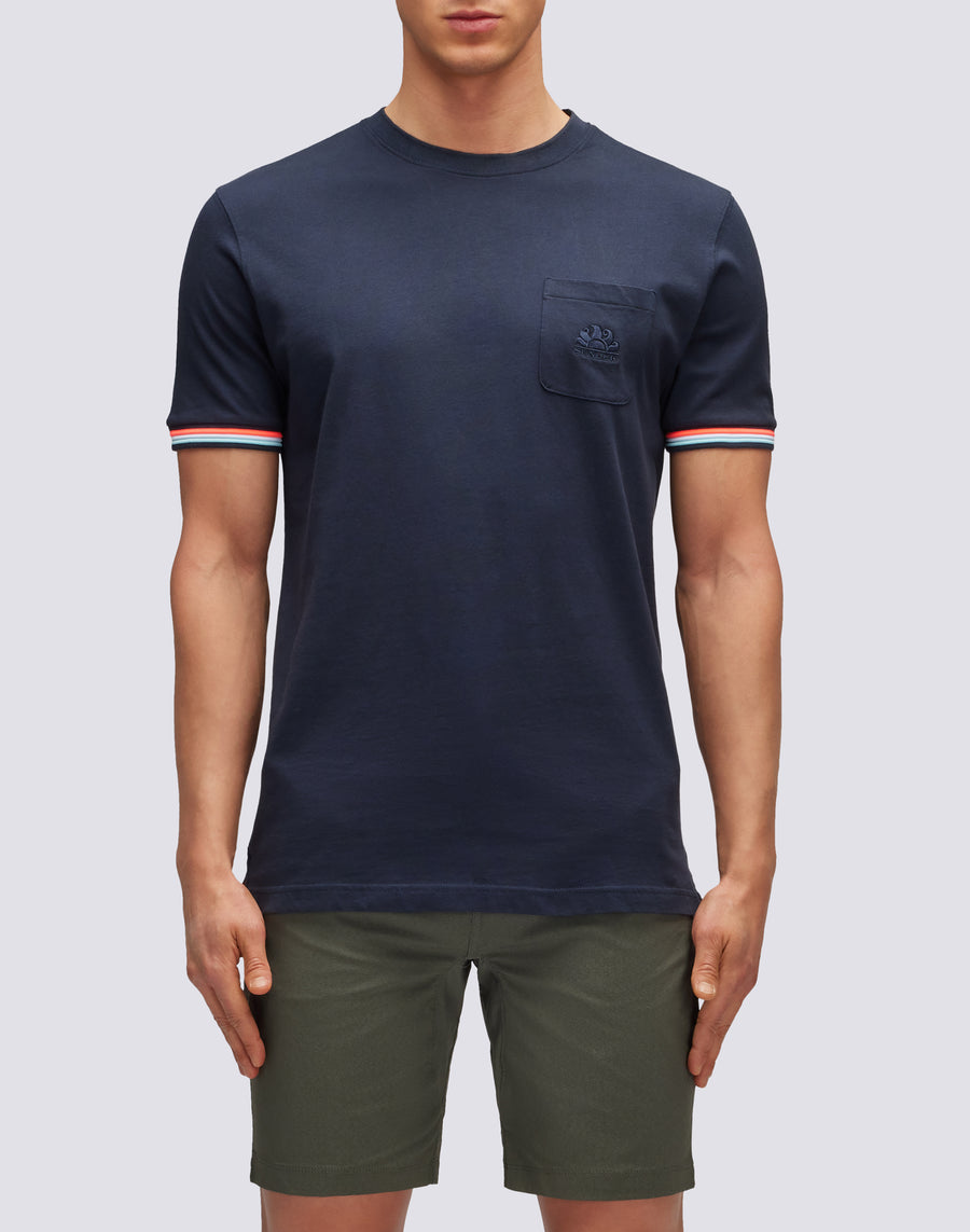 Sporty plain T-shirt with the iconic tricolour trim around the cuffs: a distinctive addition to any casual outfit Ideal for every casual look, this T-shirt pairs perfectly with trousers or shorts, or even with boardshorts for the beach.