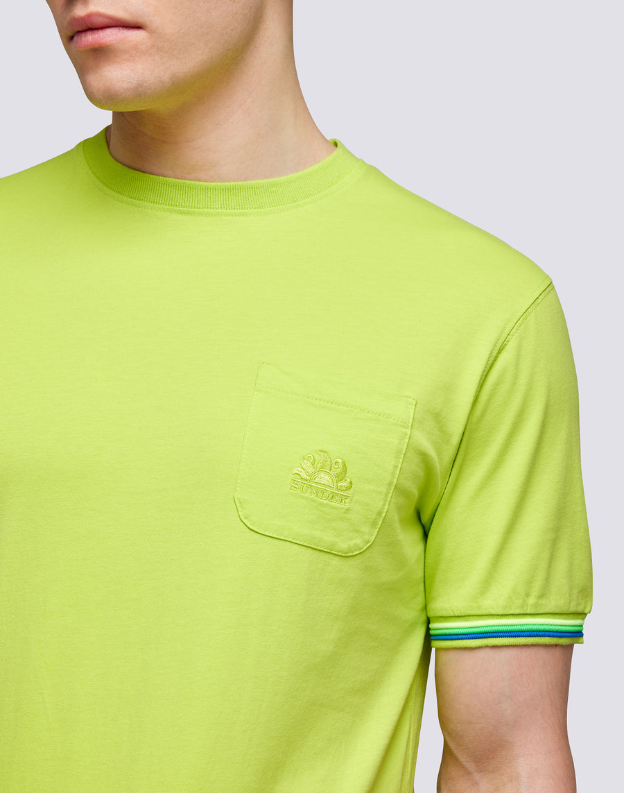 Sporty plain T-shirt with the iconic tricolour trim around the cuffs: a distinctive addition to any casual outfit Ideal for every casual look, this T-shirt pairs perfectly with trousers or shorts, or even with boardshorts for the beach.