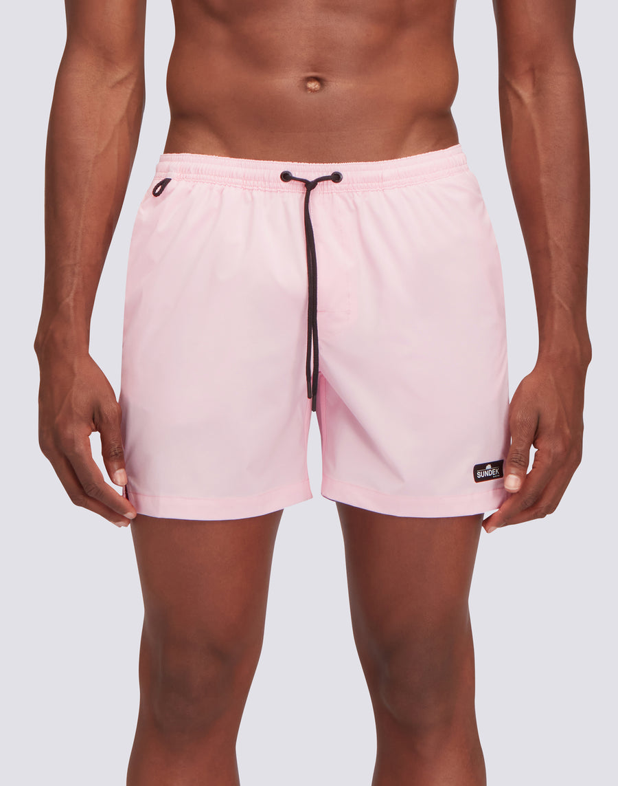 Follow the waves wearing the elastic-waisted men's swimshorts in bright colours. Lightweight, durable, quick-drying and made of 4 Way Stretch fabric. It has a practical removable waterproof pouch, attached to the waist like a key ring; ideal for keeping your mobile phone with you, without having to use pockets or other external bags. It also has Sundek's classic three-needle stitching for added durability and our iconic rainbow on the back.