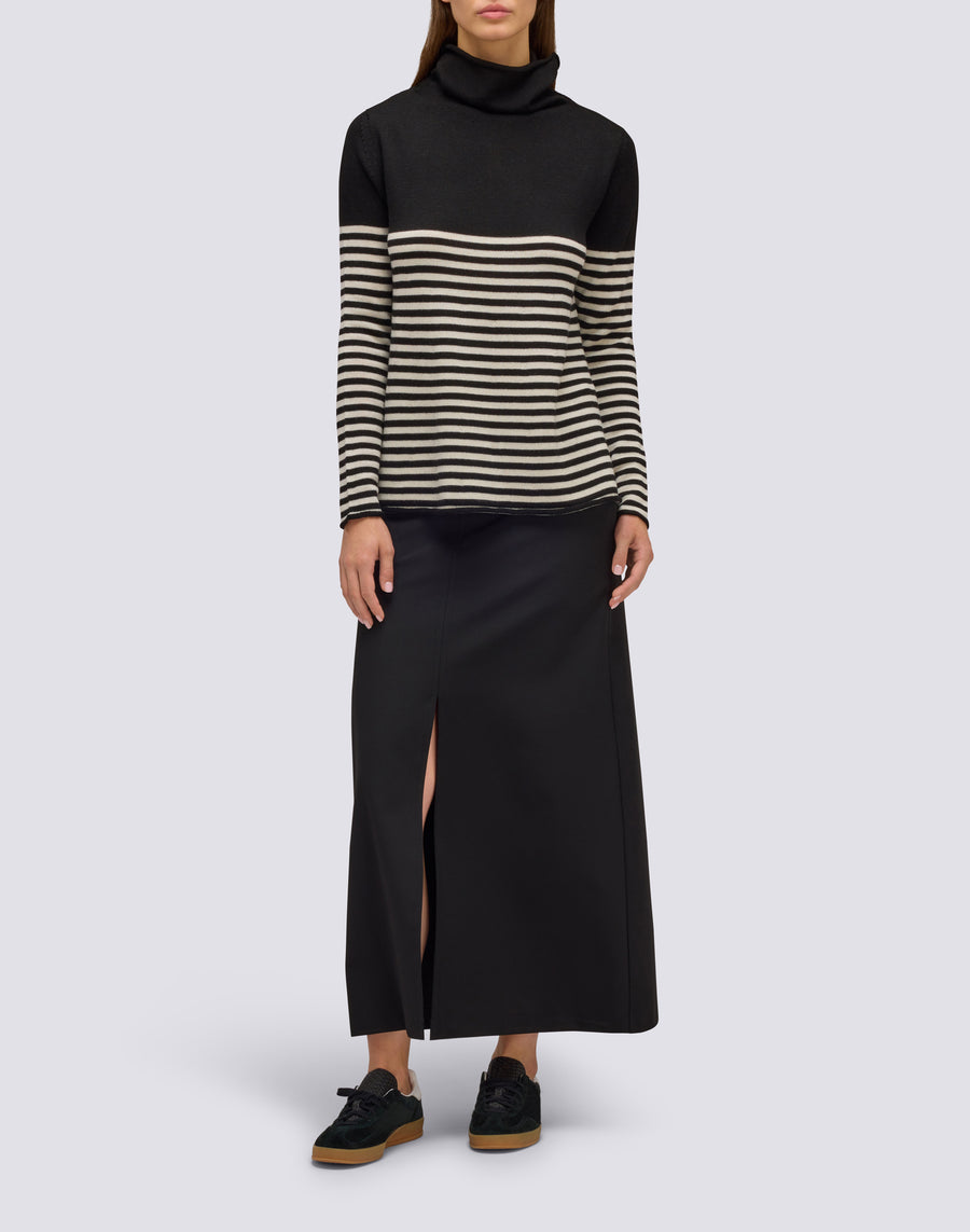 This long skirt in polyester and viscose twill combines style and comfort with a semi-elastic waist that ensures a perfect fit. The front slit design adds a touch of elegance and femininity, ideal for enhancing any look with movement and sophistication.