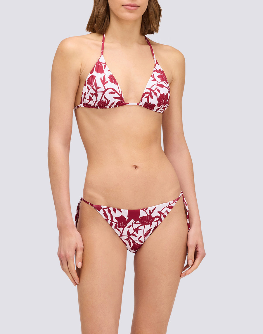 The triangle bikini is a timeless beachwear classic, loved for its simplicity, versatility and ability to suit different body types. The design is minimalist and can be tied behind the neck and back with ties or straps. One of the main advantages is the adjustability of the ties, which allows you to tailor the fit to your needs. The fabrics and patterns range from solid colours to floral, geometric and animal prints. Thanks to its minimal coverage, it is perfect for those who want an even tan. Its versatility makes it suitable for different body shapes. It is a bikini that lends itself to multiple combinations to create stylish and personalised beach looks.