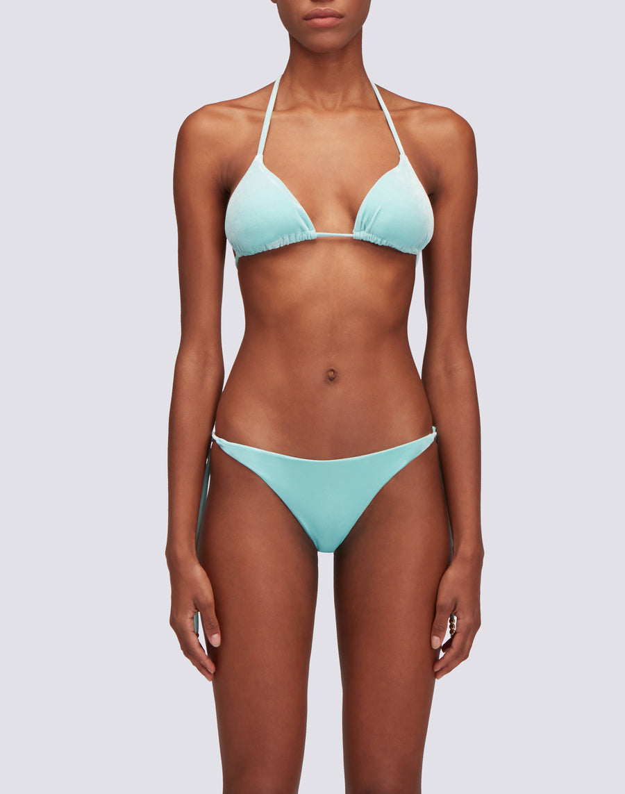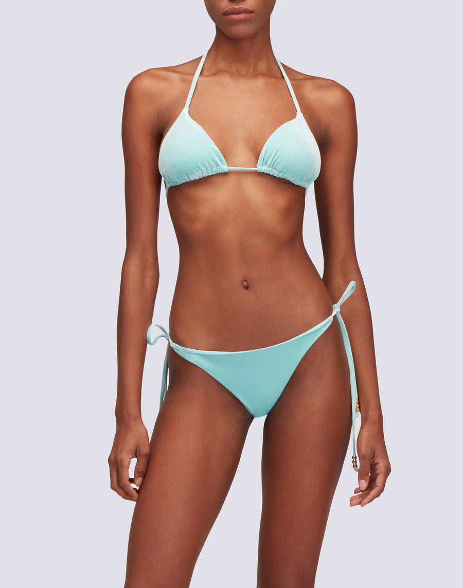 Adjustable triangle top made of light velvet and decorated with gold beads. Informal and refined, to be worn with the matching brief.