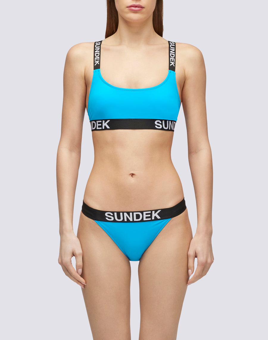 Performance fabric that supports all movements and a sporty character defined by the jacquard elastic band with contrasting logo: combine these beach culottes with the coordinated top to create a strong look that will not go unnoticed.